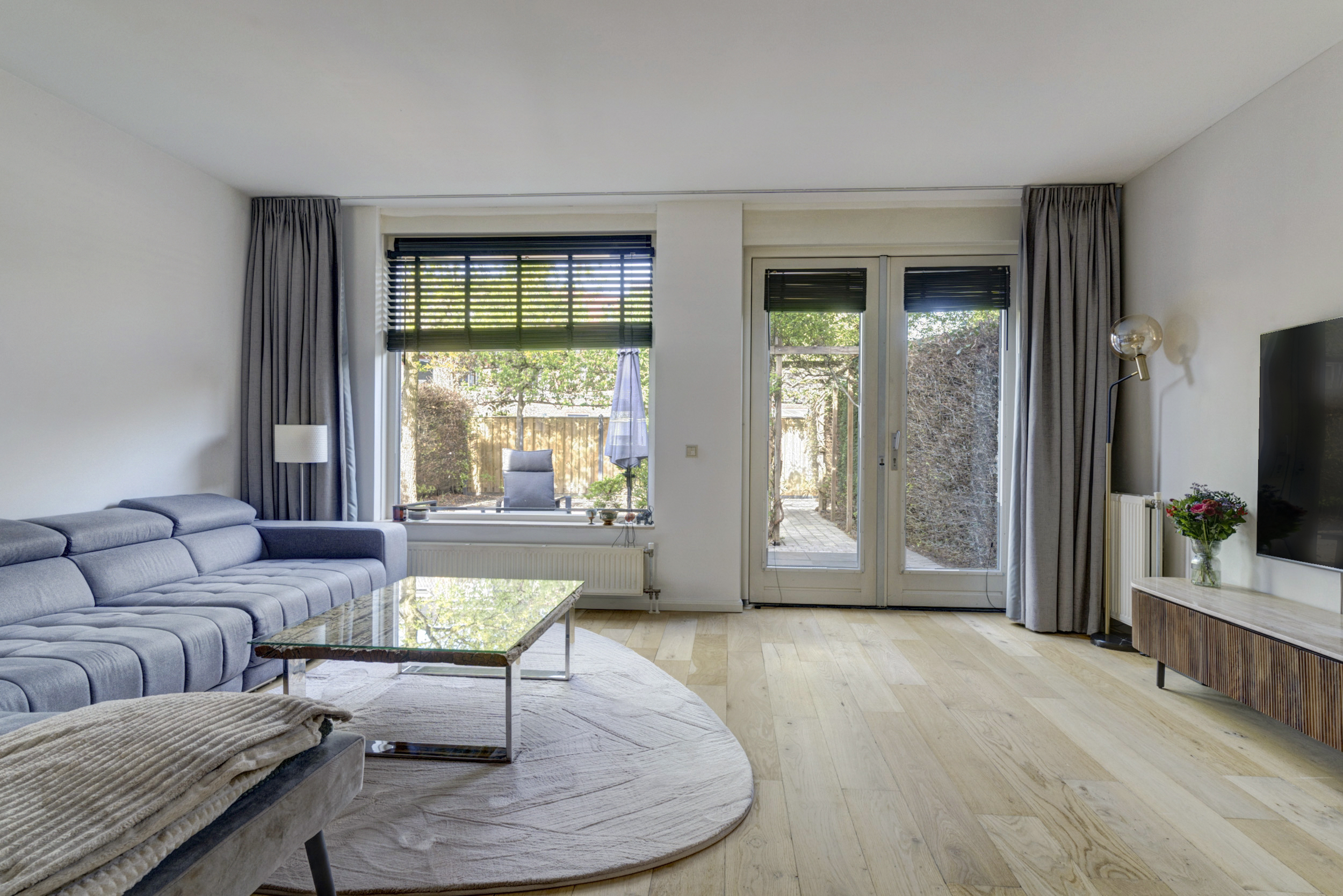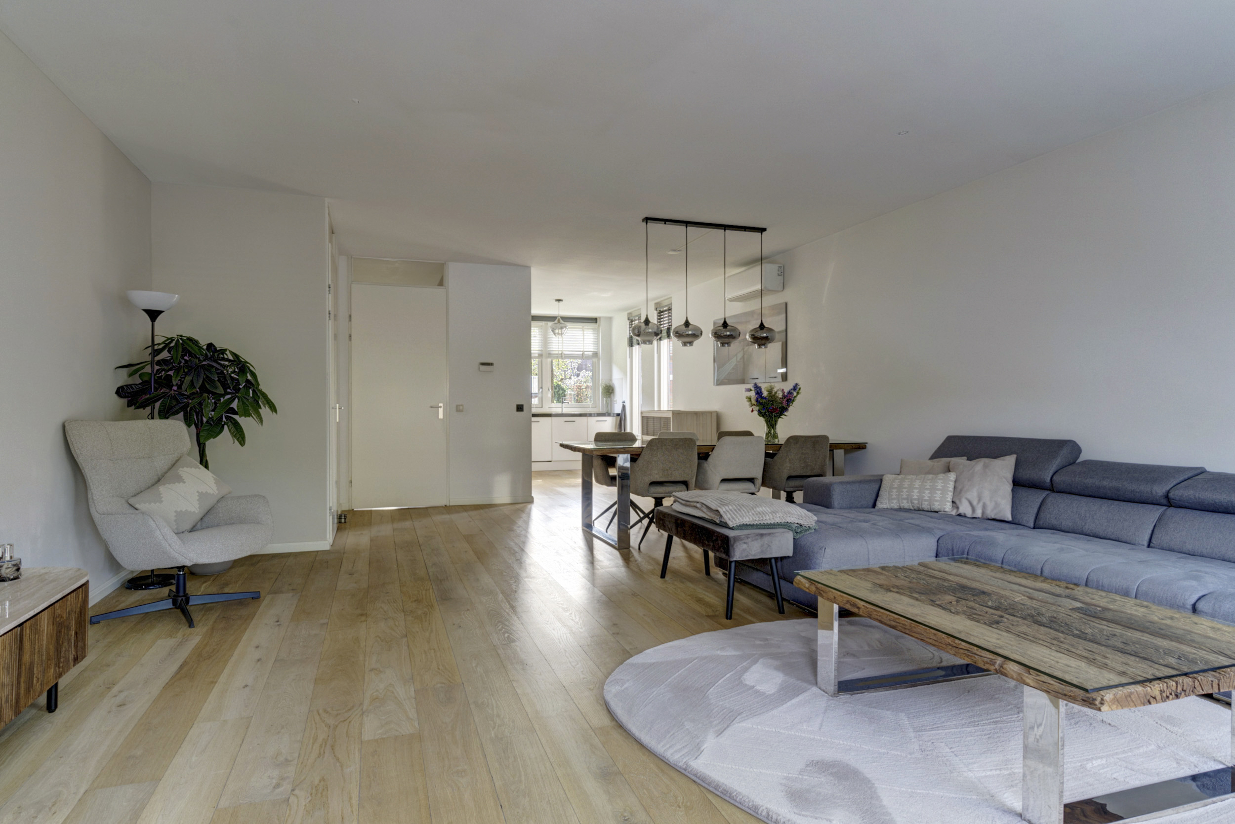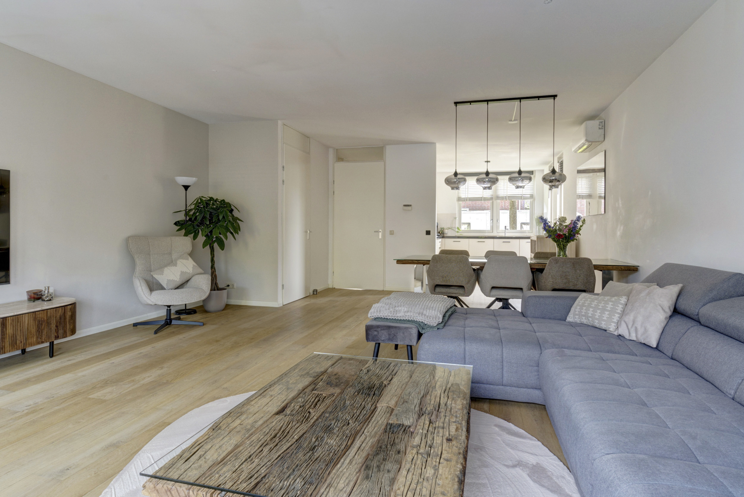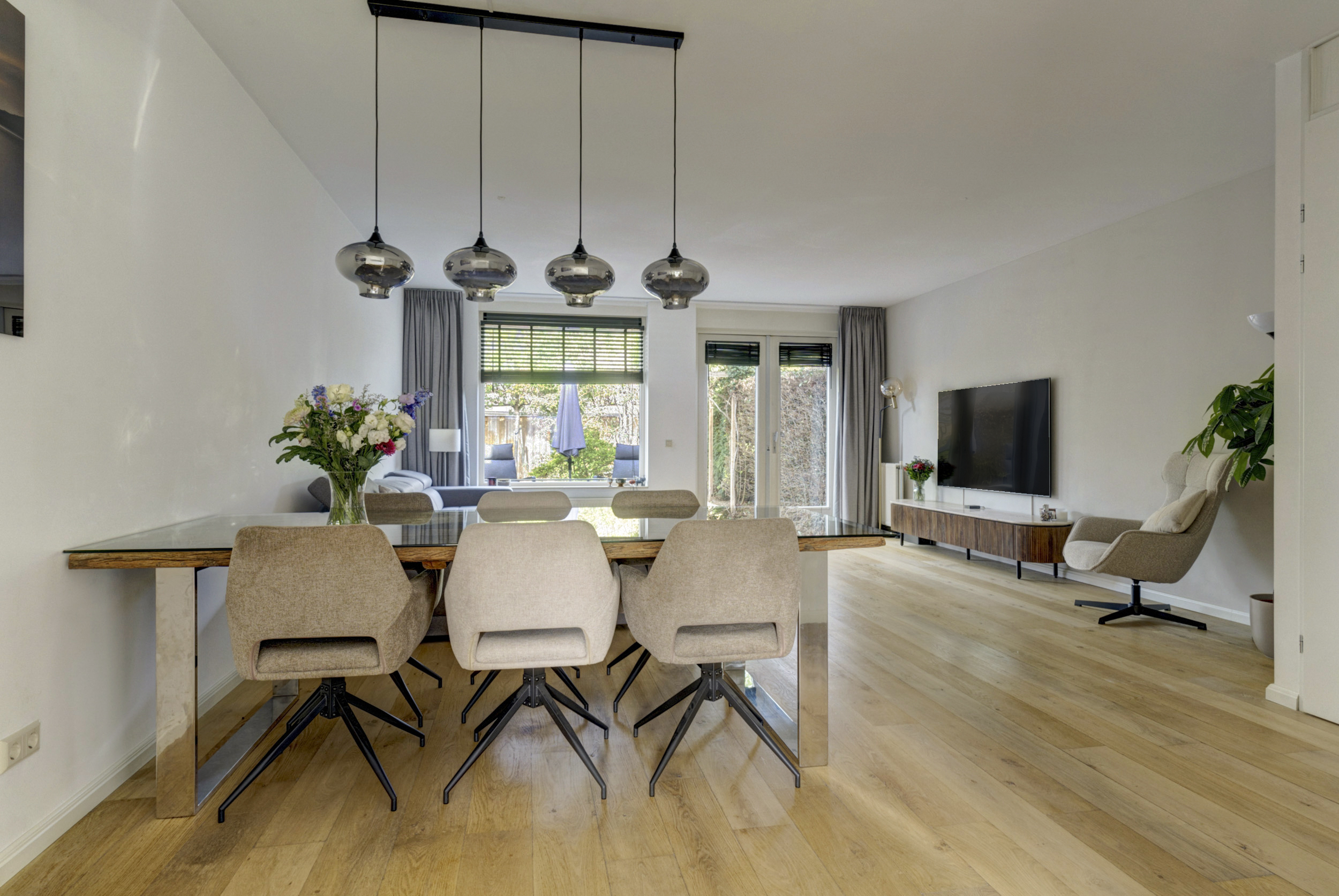 Bij binnenkomst stap je in de ruime hal met meterkast, garderoberuimte en een modern toilet met fonteintje. Vanuit hier loop je door naar de sfeervolle, uitgebouwde woonkamer. Deze leefruimte is heerlijk licht dankzij de grote raampartijen en de dubbele tuindeuren naar de achtertuin. Er is volop ruimte voor een royale zithoek én een grote eettafel waar je gezellig samenkomt met familie en vrienden. De praktische trapkast biedt extra bergruimte voor voorraad, huishoudelijke spullen of speelgoed.