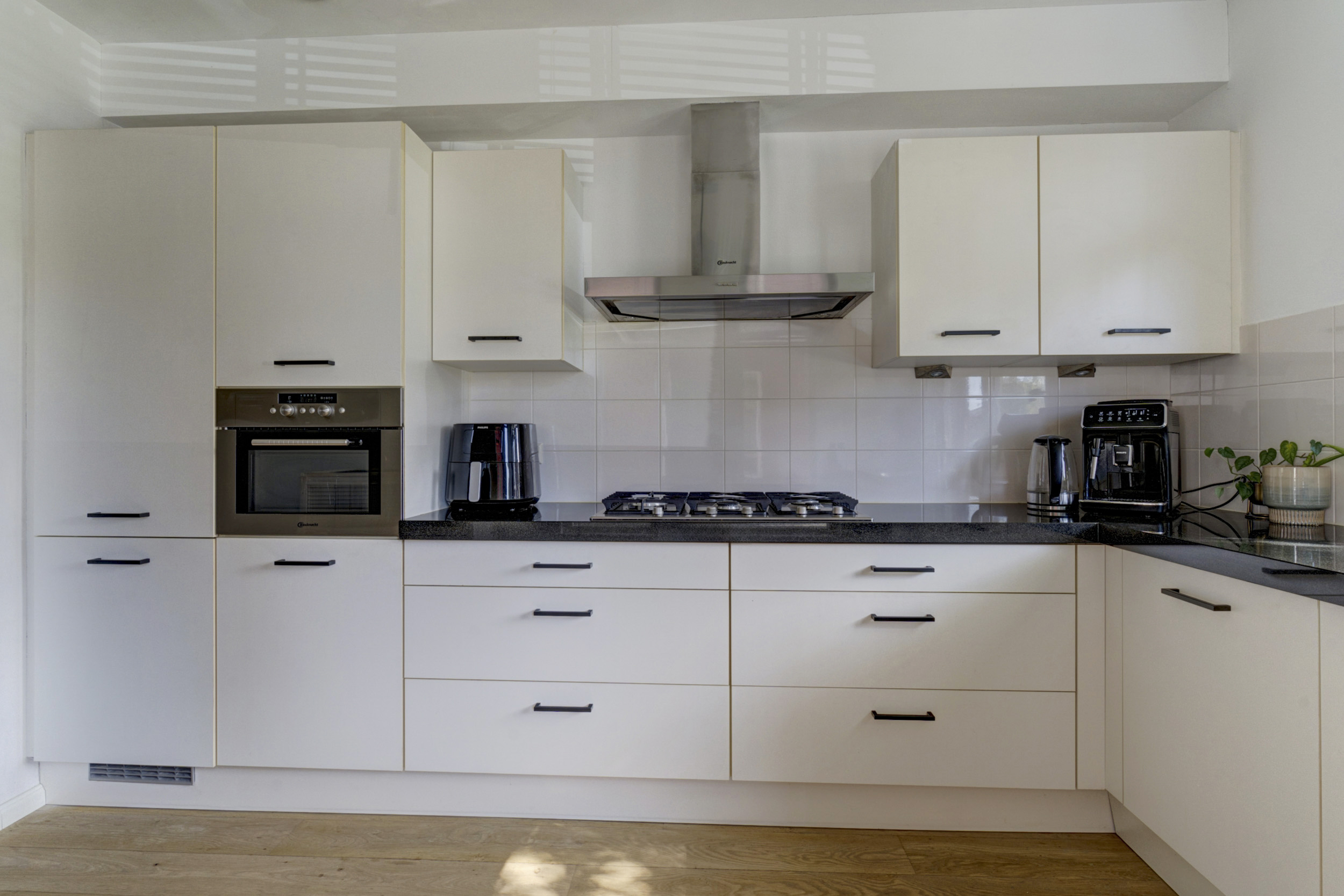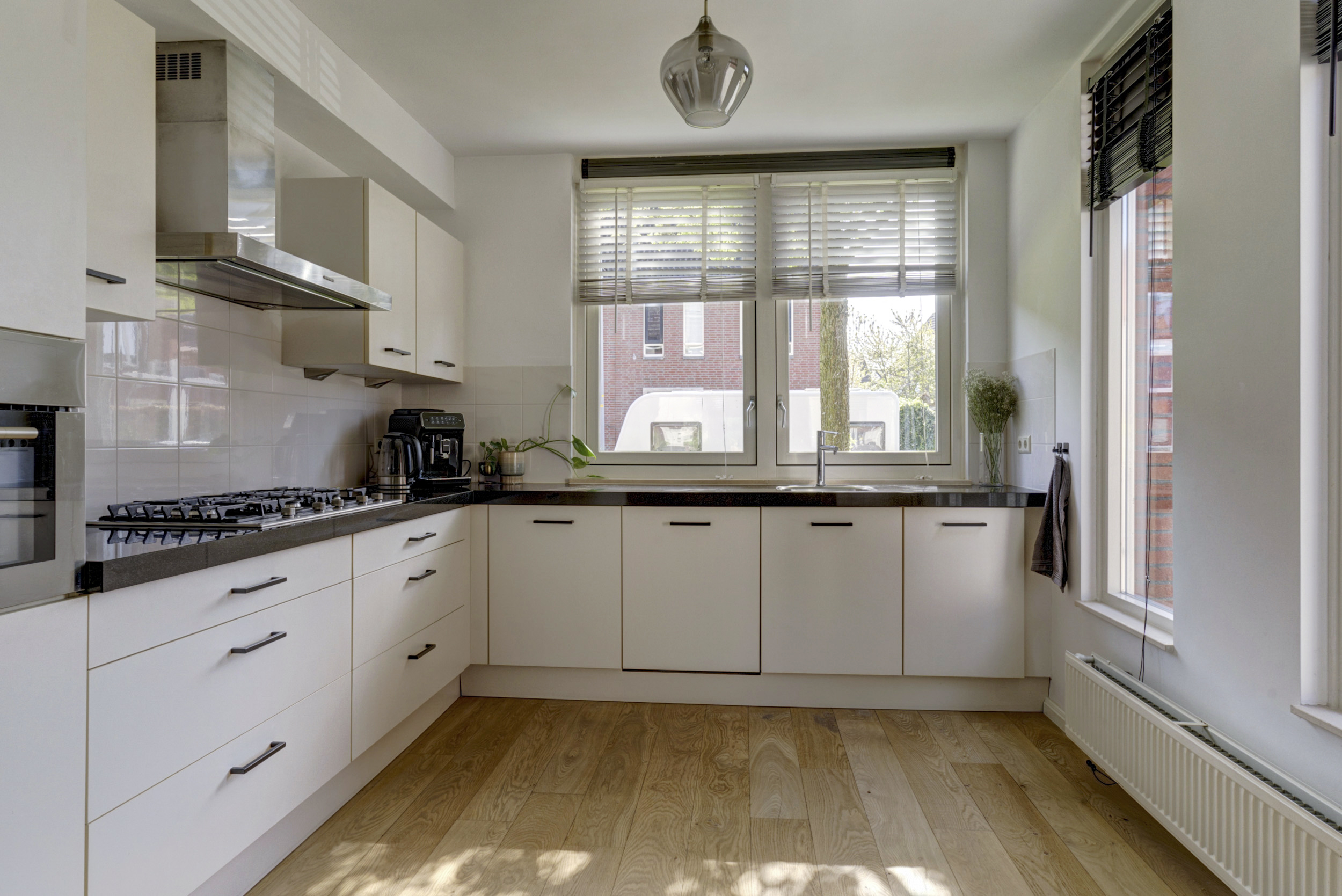 Aan de voorzijde van de woning bevindt zich de open keuken, die prettig is opgesteld en voorzien van een complete inrichting met diverse inbouwapparatuur. Denk aan een kookplaat, afzuigkap, oven, koelkast, vaatwasser en voldoende kastruimte. Terwijl je kookt, kijk je uit over de rustige straat – een fijne plek waar functionaliteit en gezelligheid samenkomen.