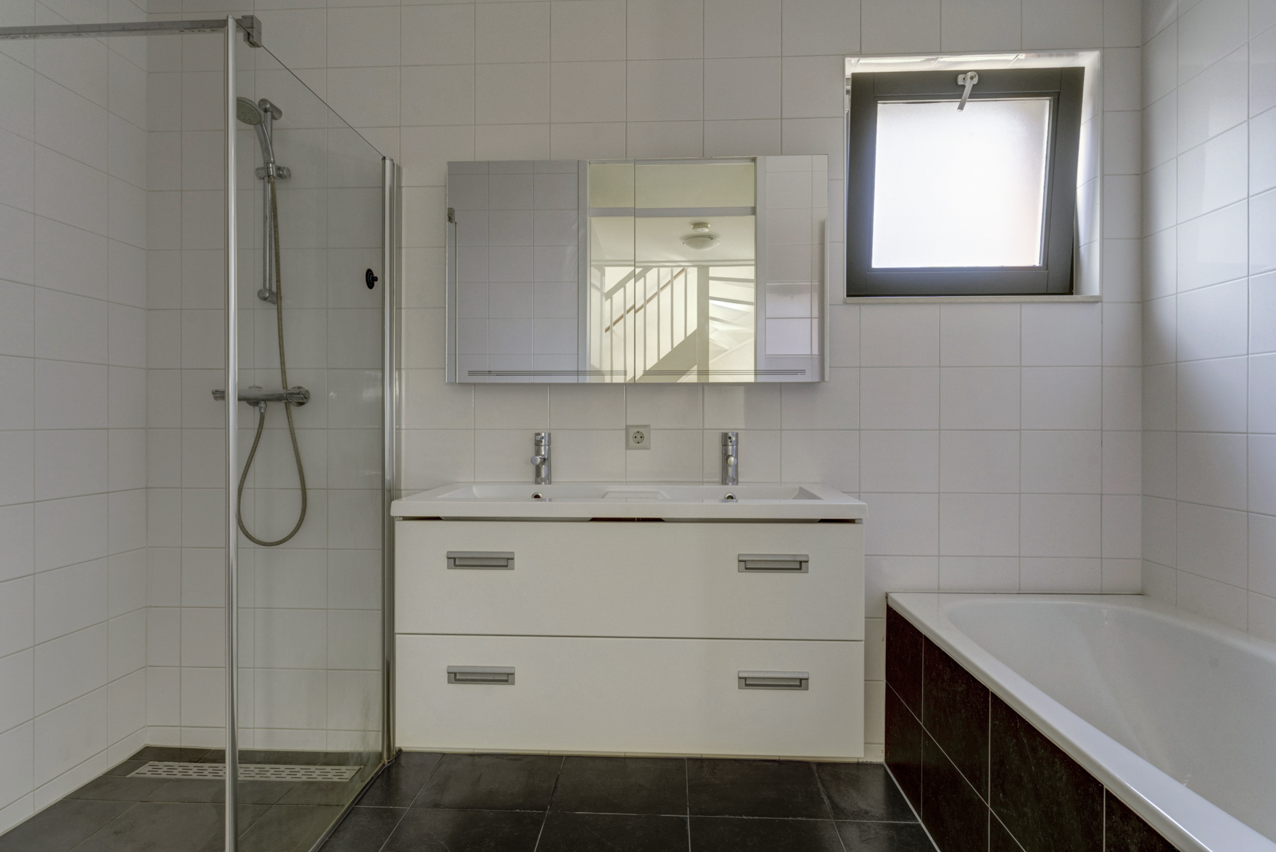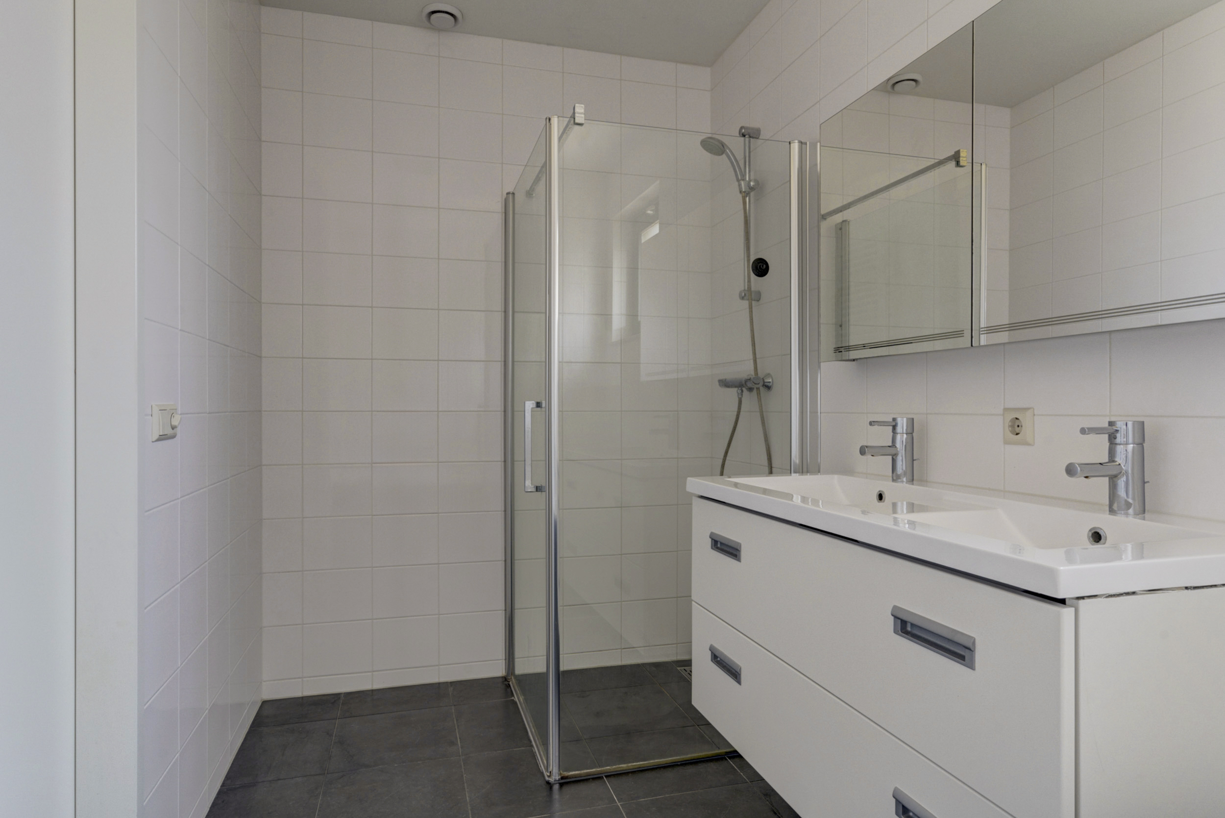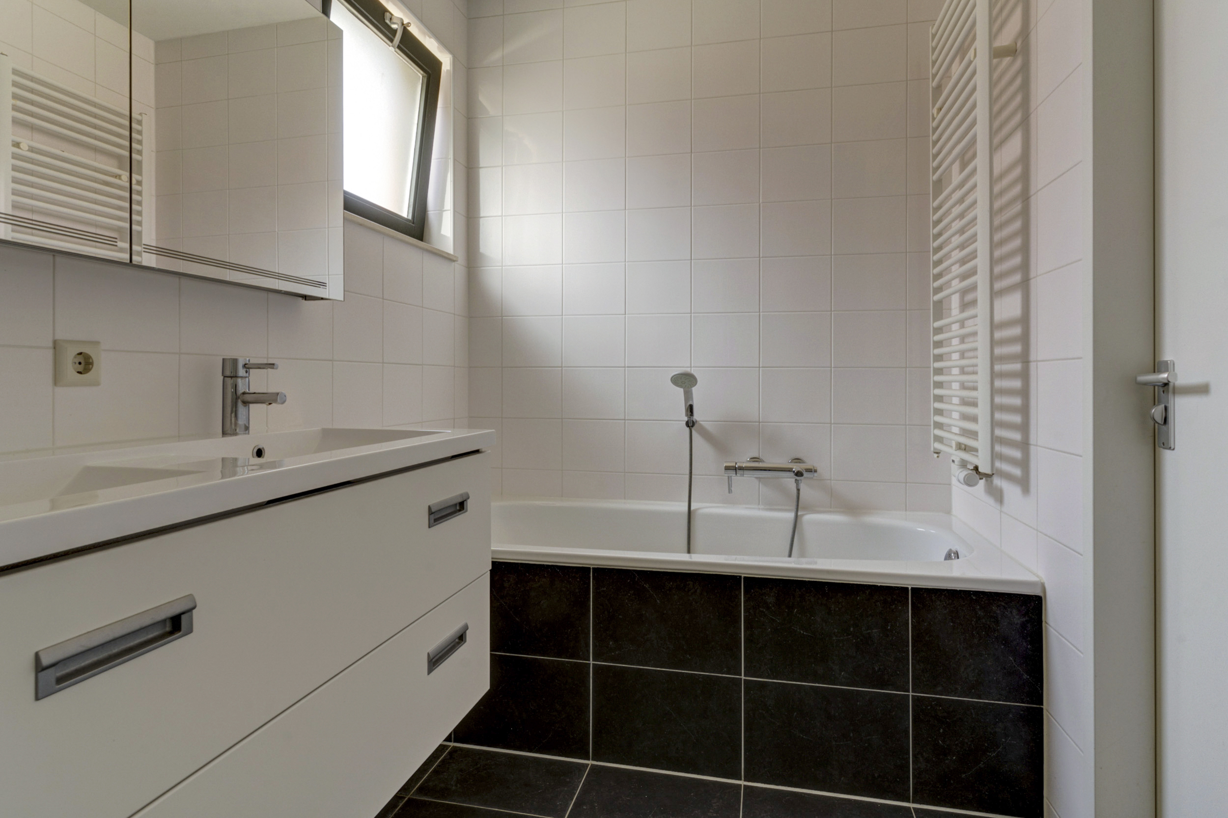 De badkamer is compleet uitgevoerd en ingericht met een ligbad, een separate douche en twee wastafels. Hier begin je de dag ontspannen en heb je voldoende ruimte voor het hele gezin.