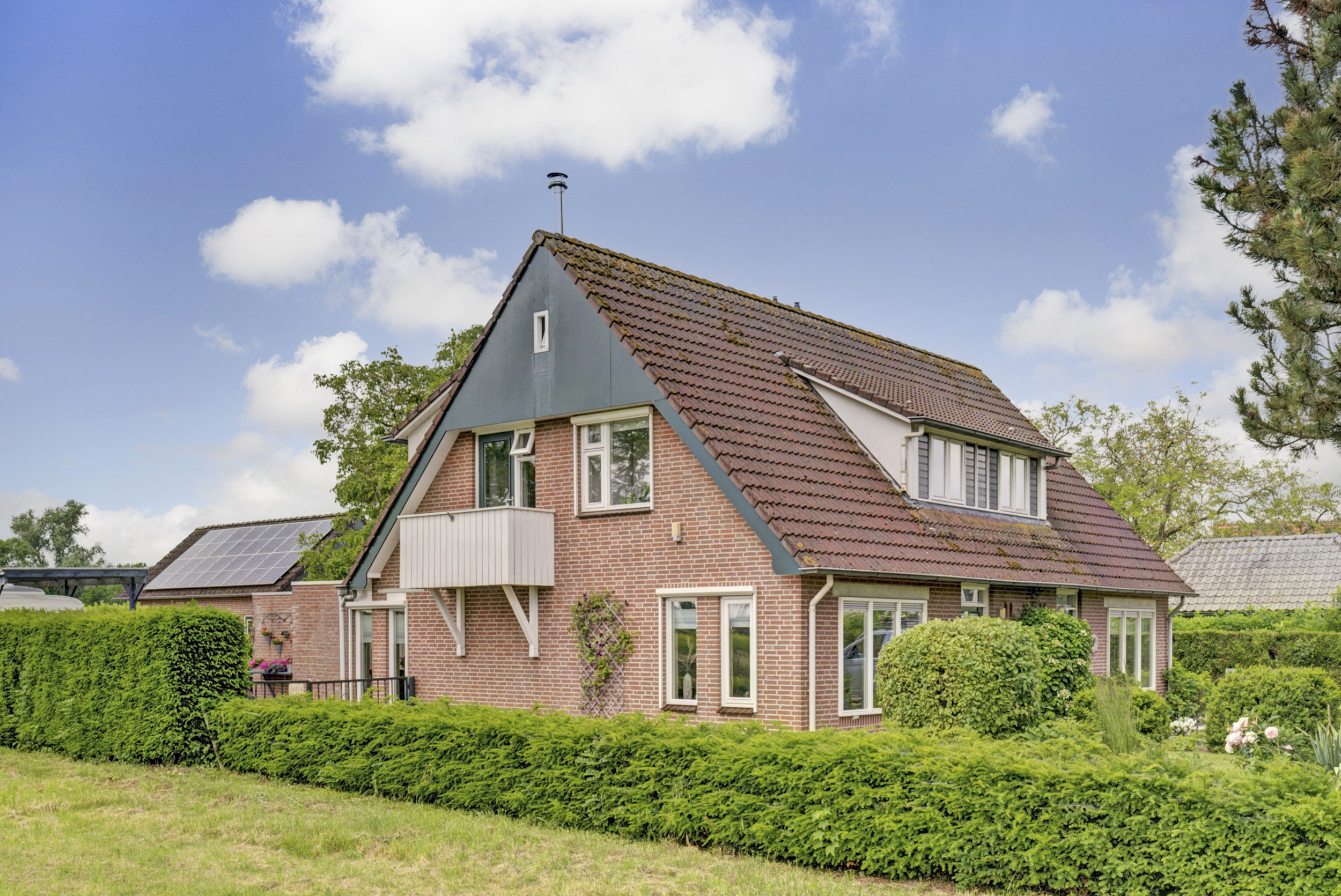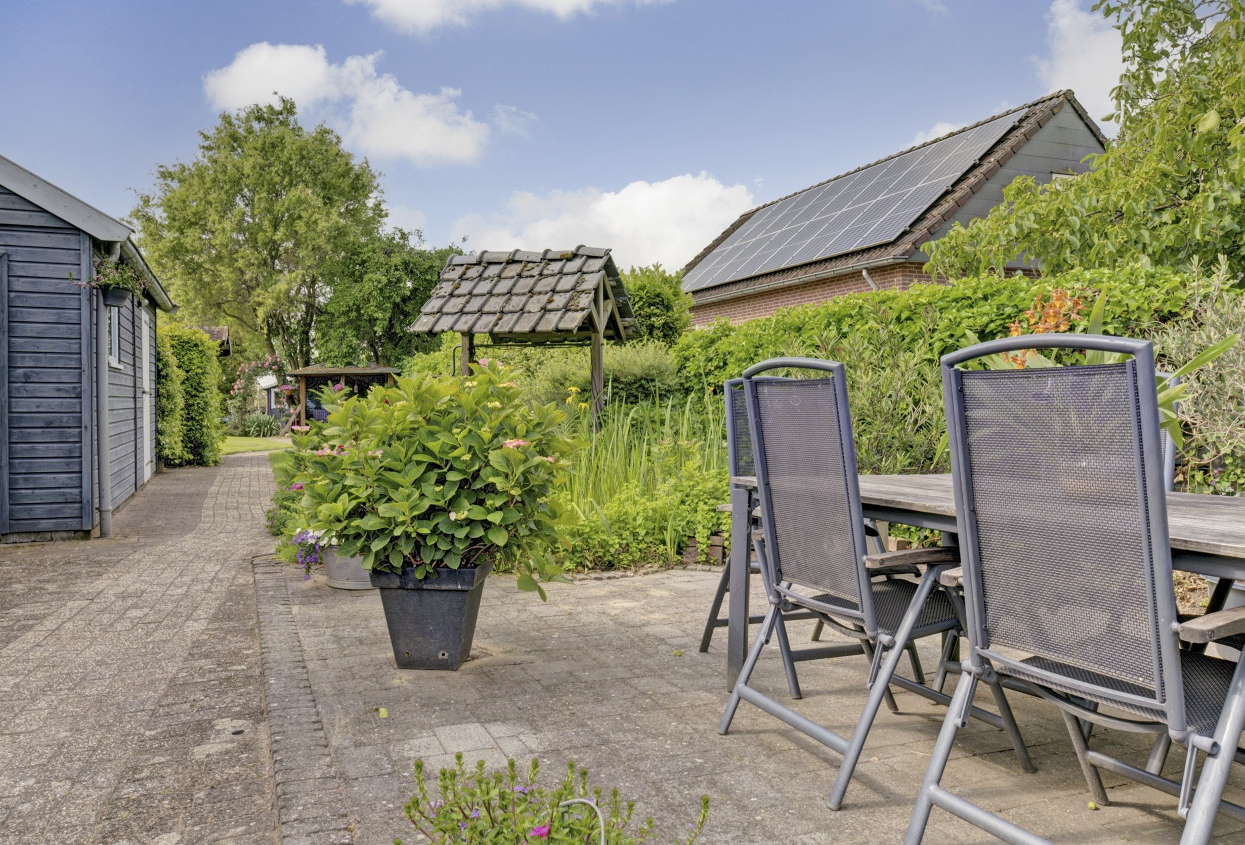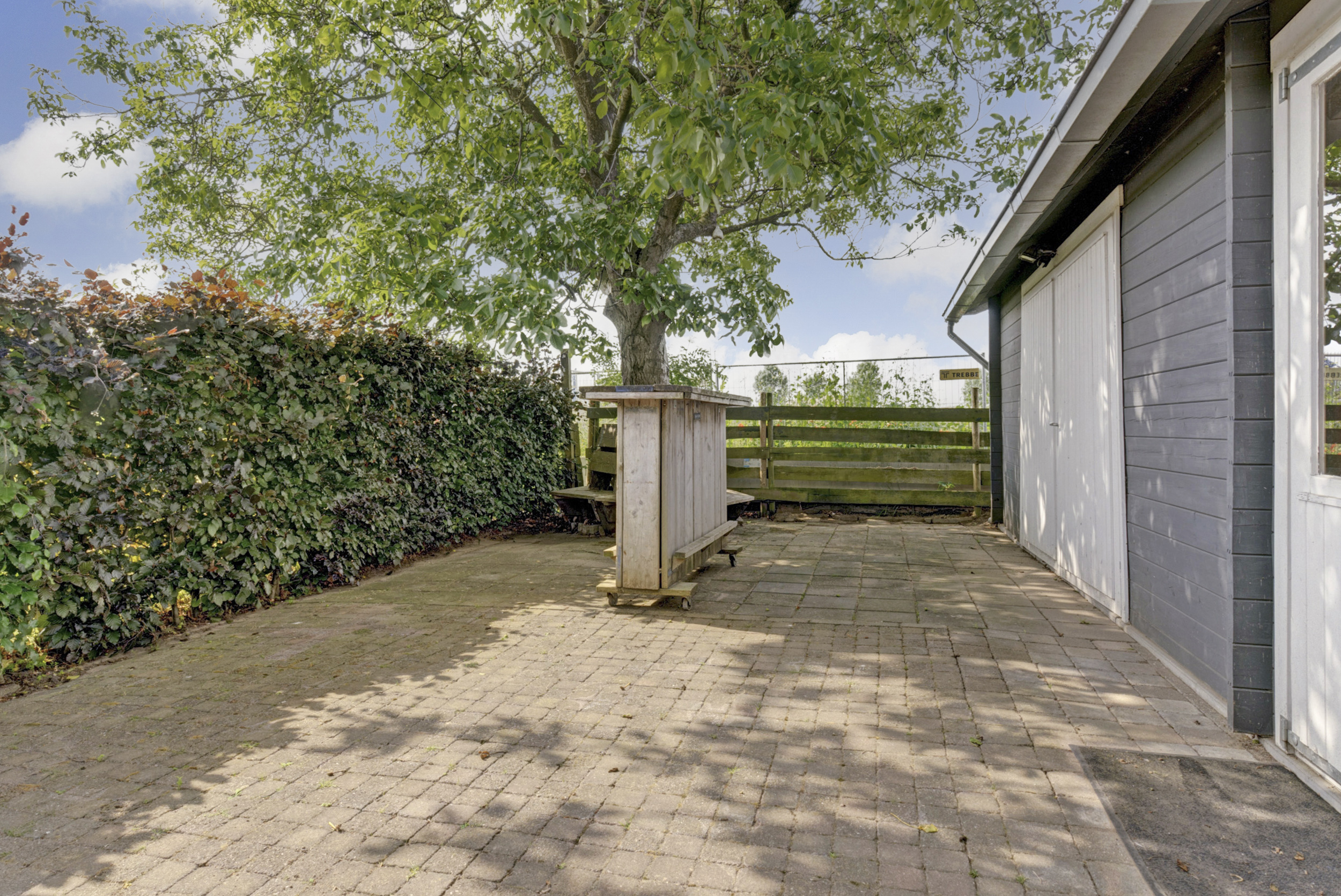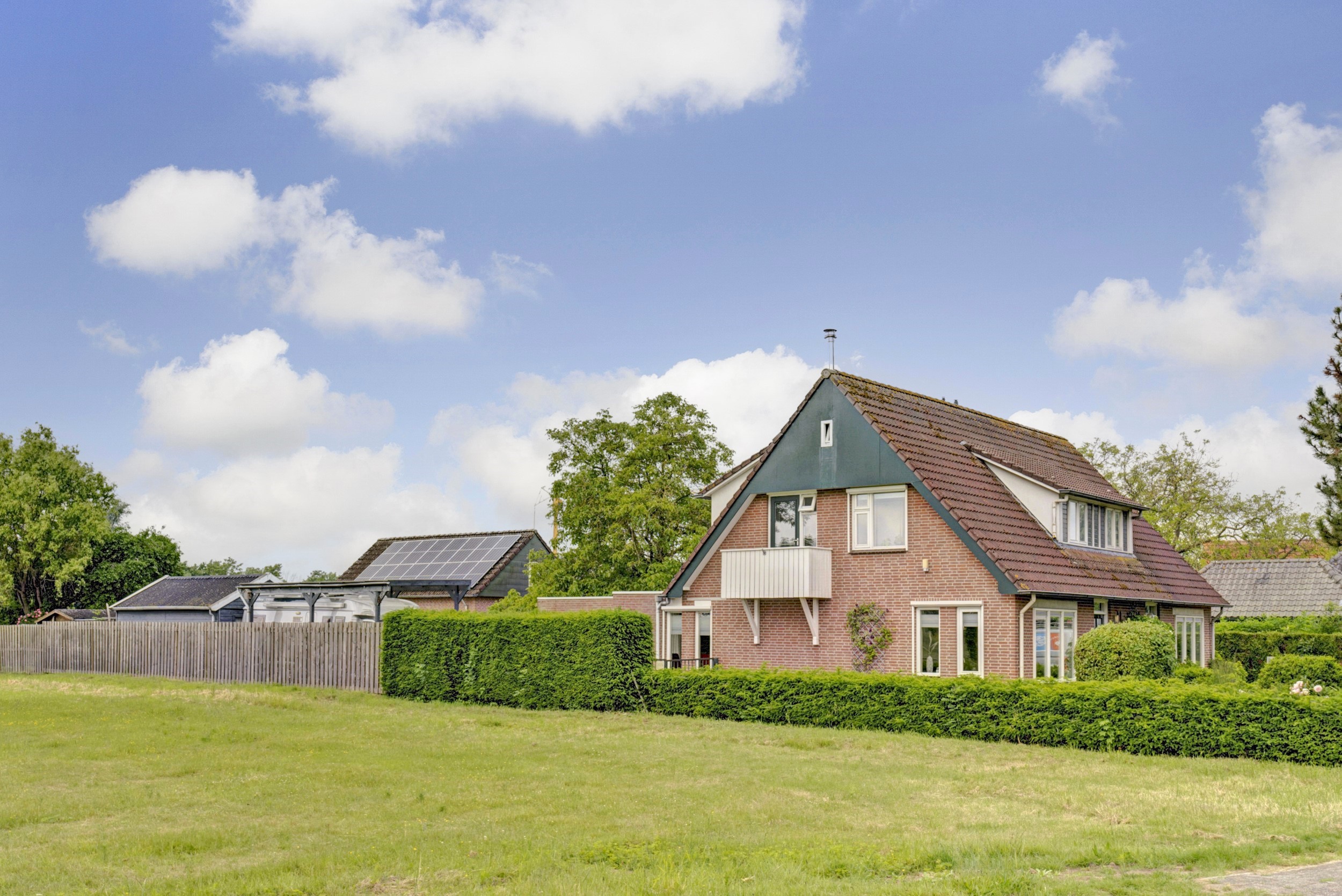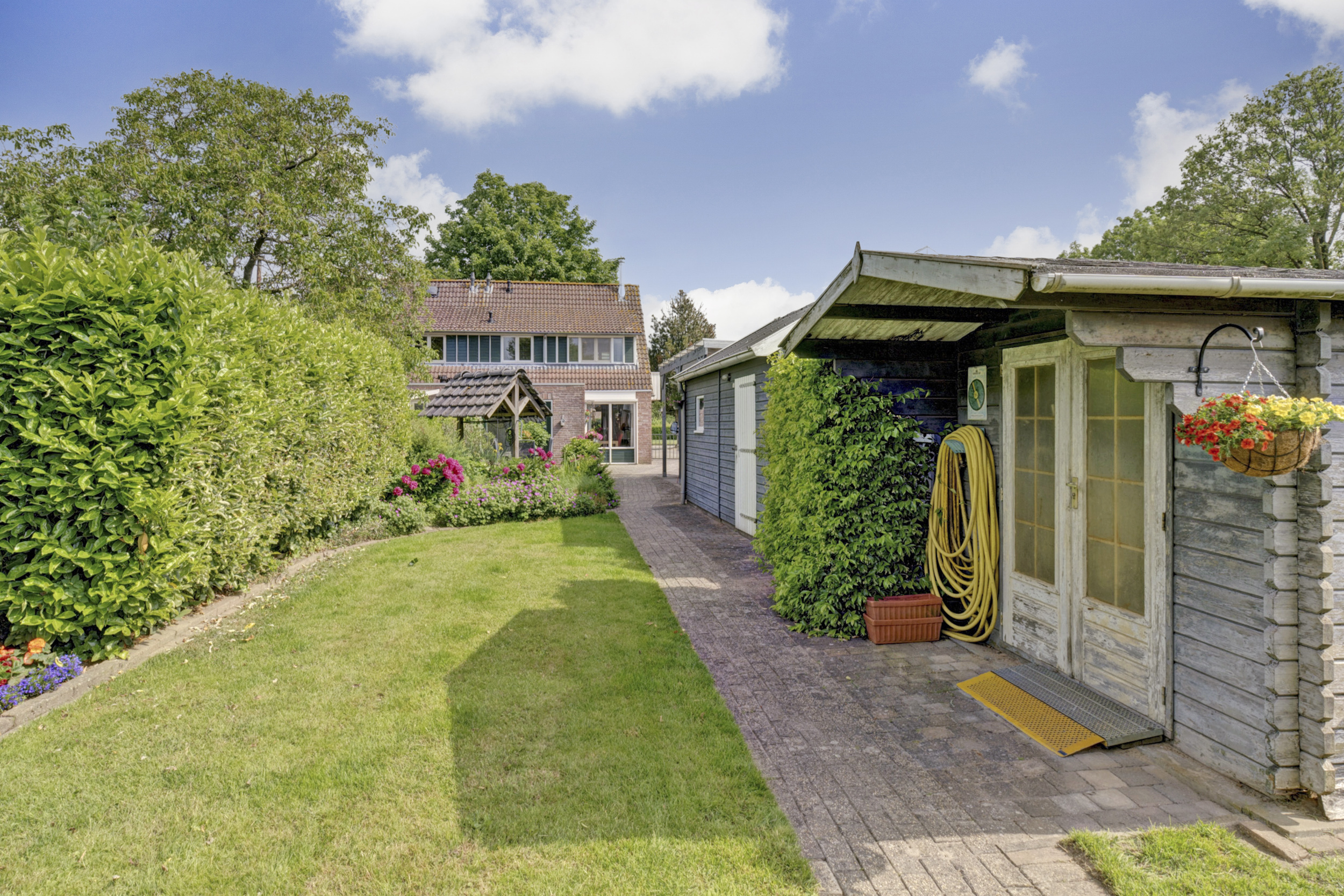 Op de oprit is parkeergelegenheid voor meerdere auto’s aanwezig en onder de carport kan de auto beschut staan. In de tuin staan o.a. nog een houten schuur en een 2e vrijstaand bijgebouw, dat perfect te gebruiken is als hobbyruimte, ontspanningsruimte of atelier.
