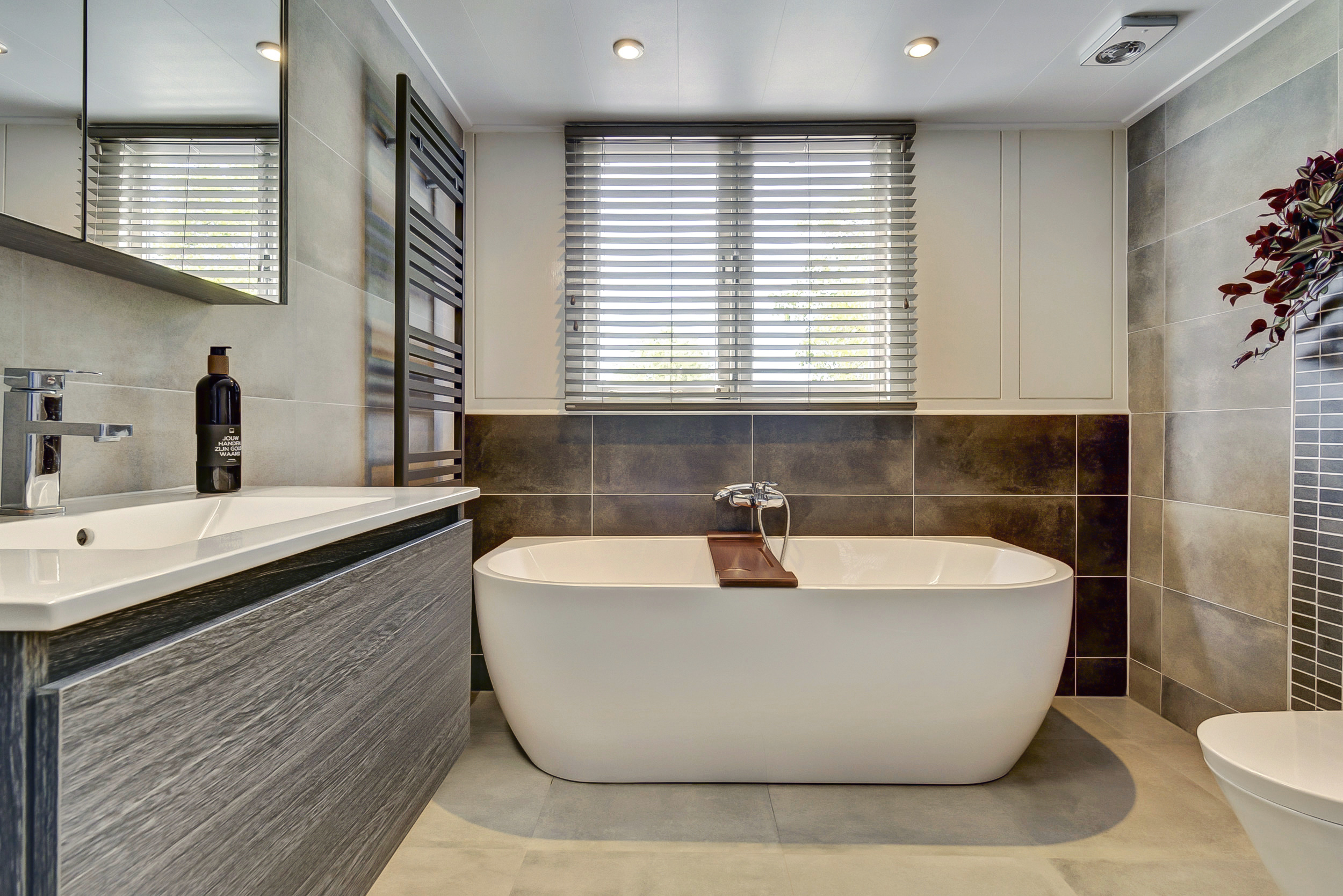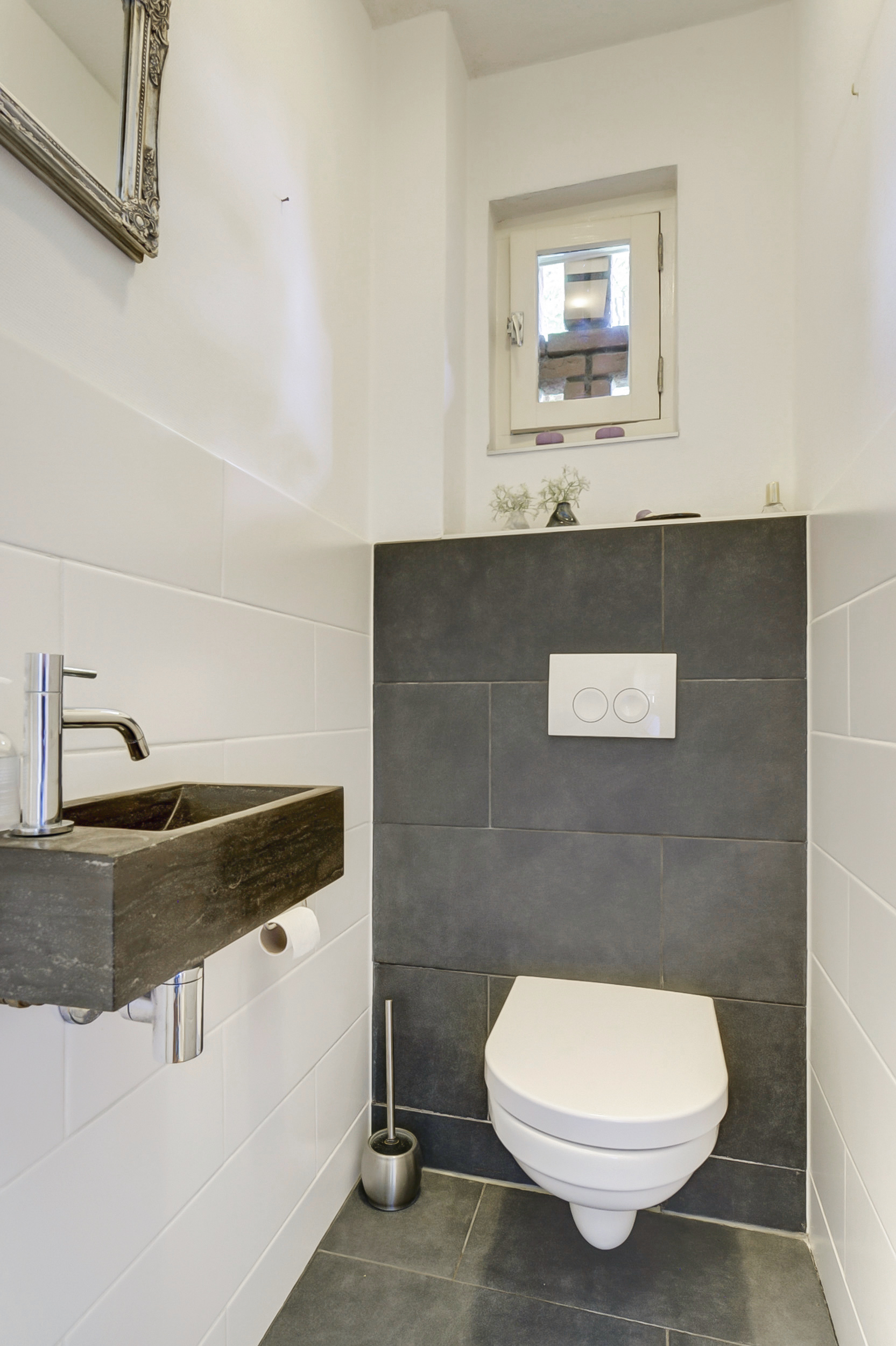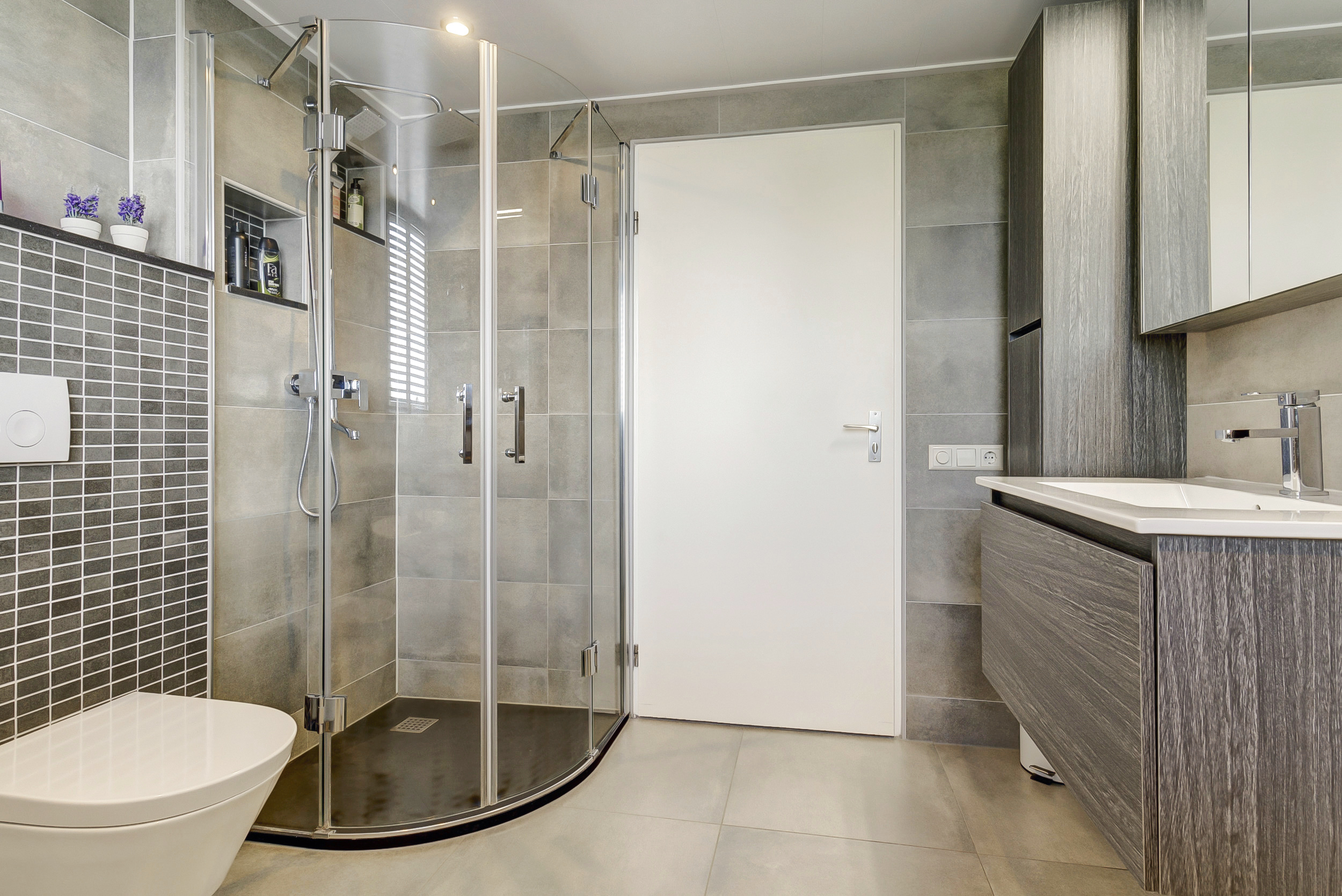 – Badkamer uit 2020 en een modern toilet, beide uitgevoerd in neutrale kleurstellingen.