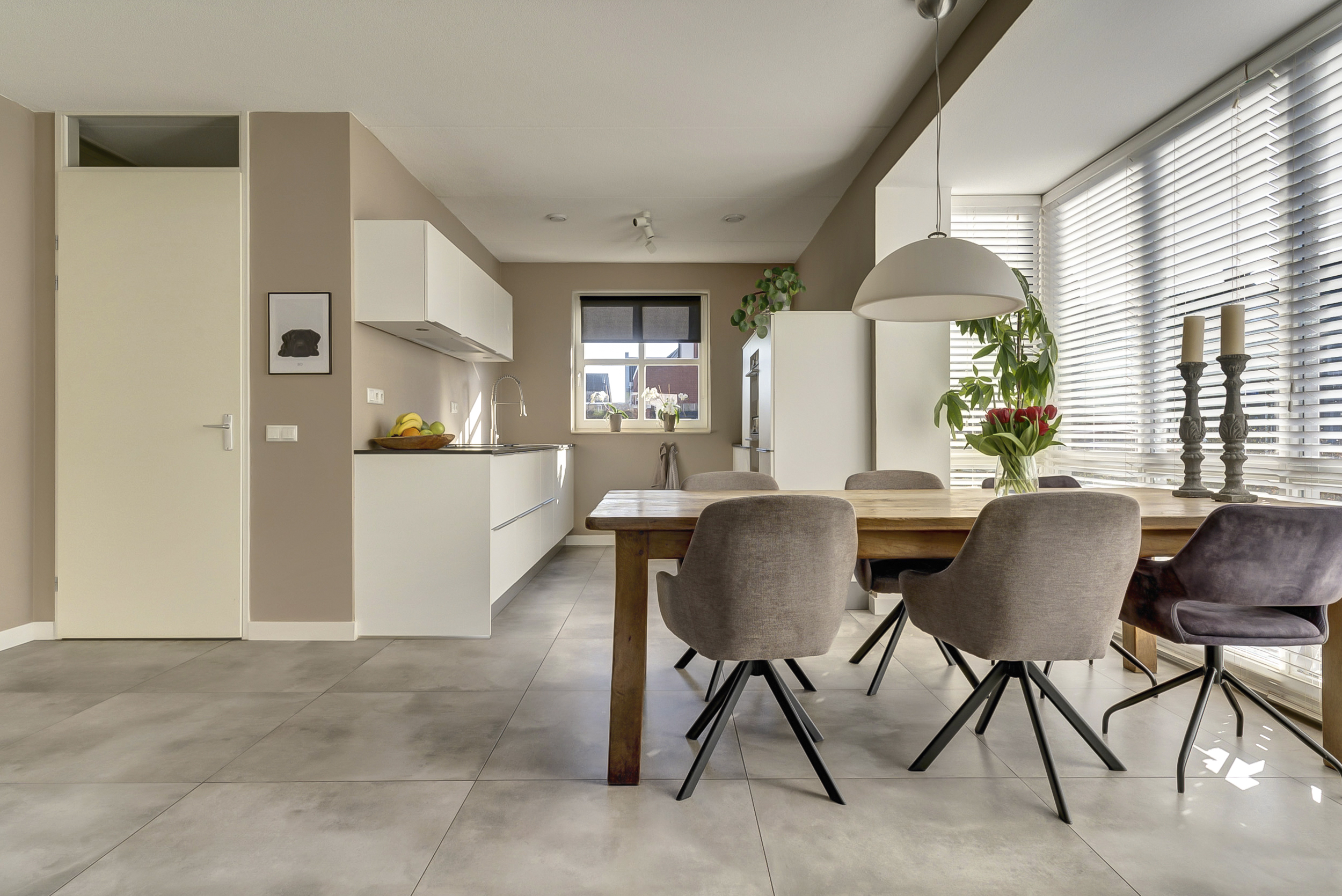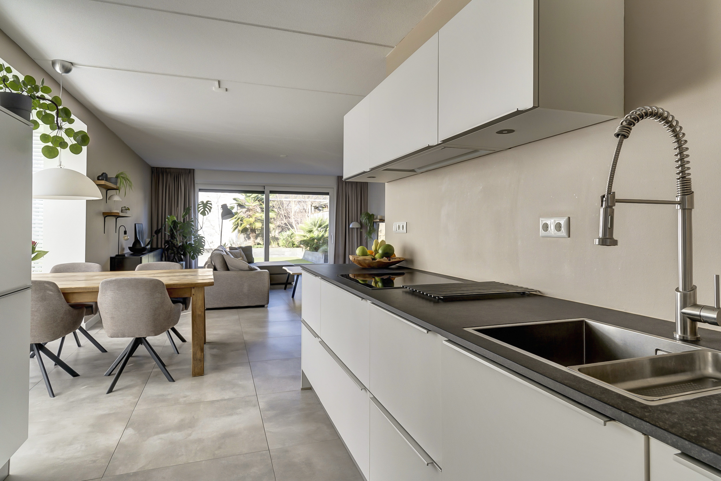 Via de grote schuifpui stap je zo de achtertuin in, waardoor binnen en buiten op mooie dagen naadloos in elkaar overlopen.