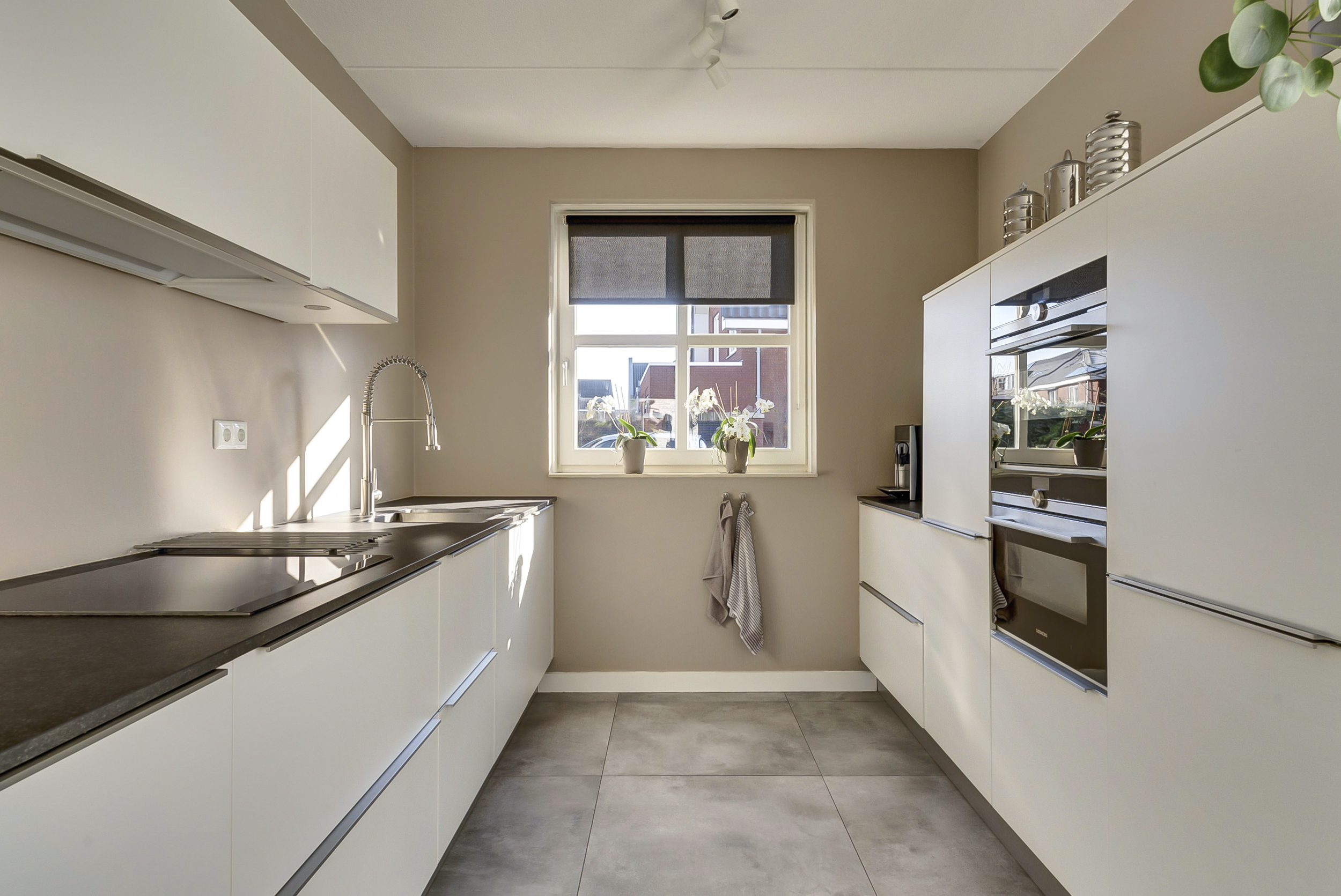 Aan de voorzijde van de woning ligt de open keuken. Deze moderne keuken heeft een prettige opstelling en is voorzien van diverse complete inbouwapparatuur, waardoor koken hier echt een plezier wordt.