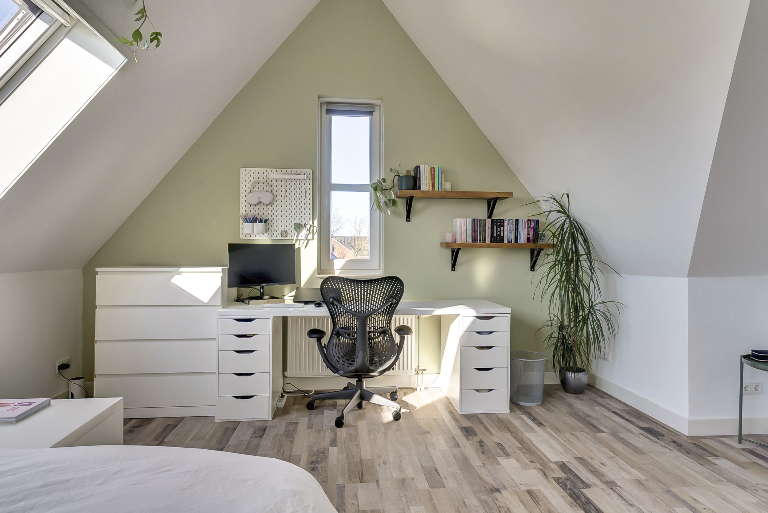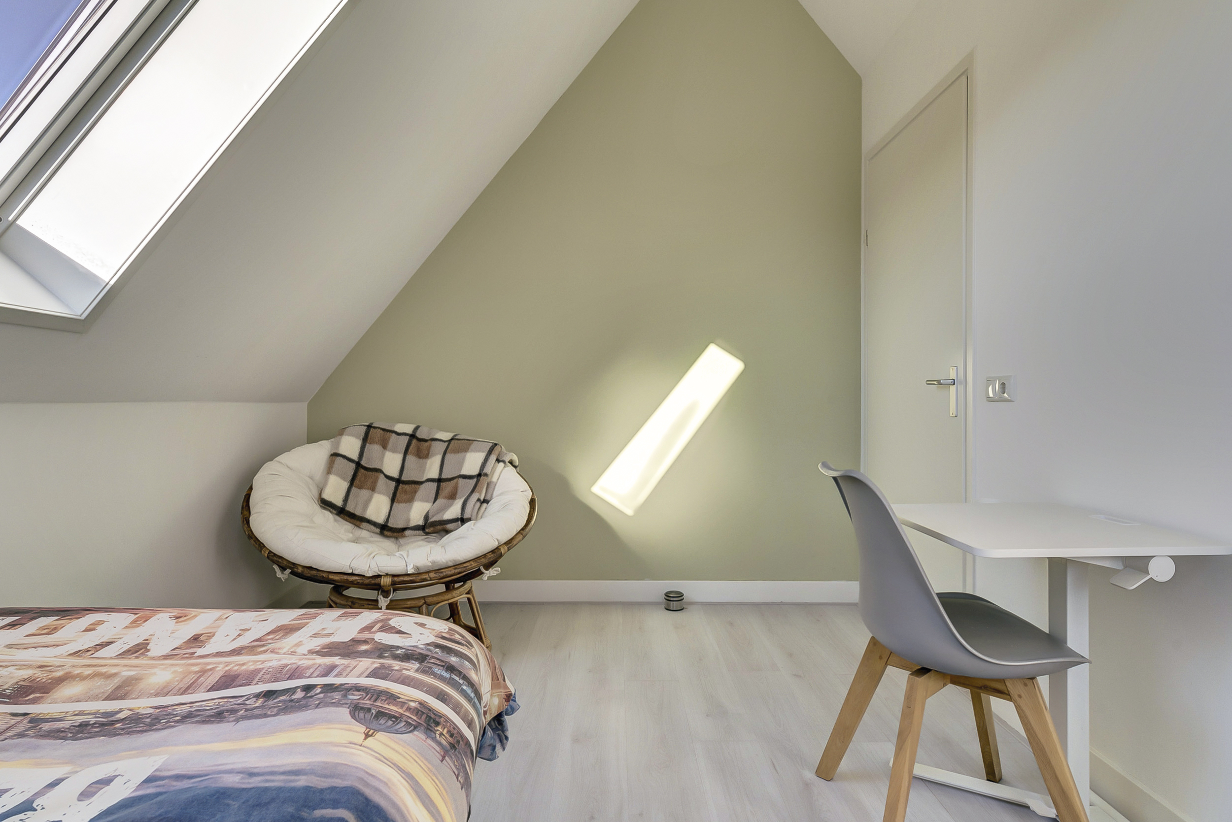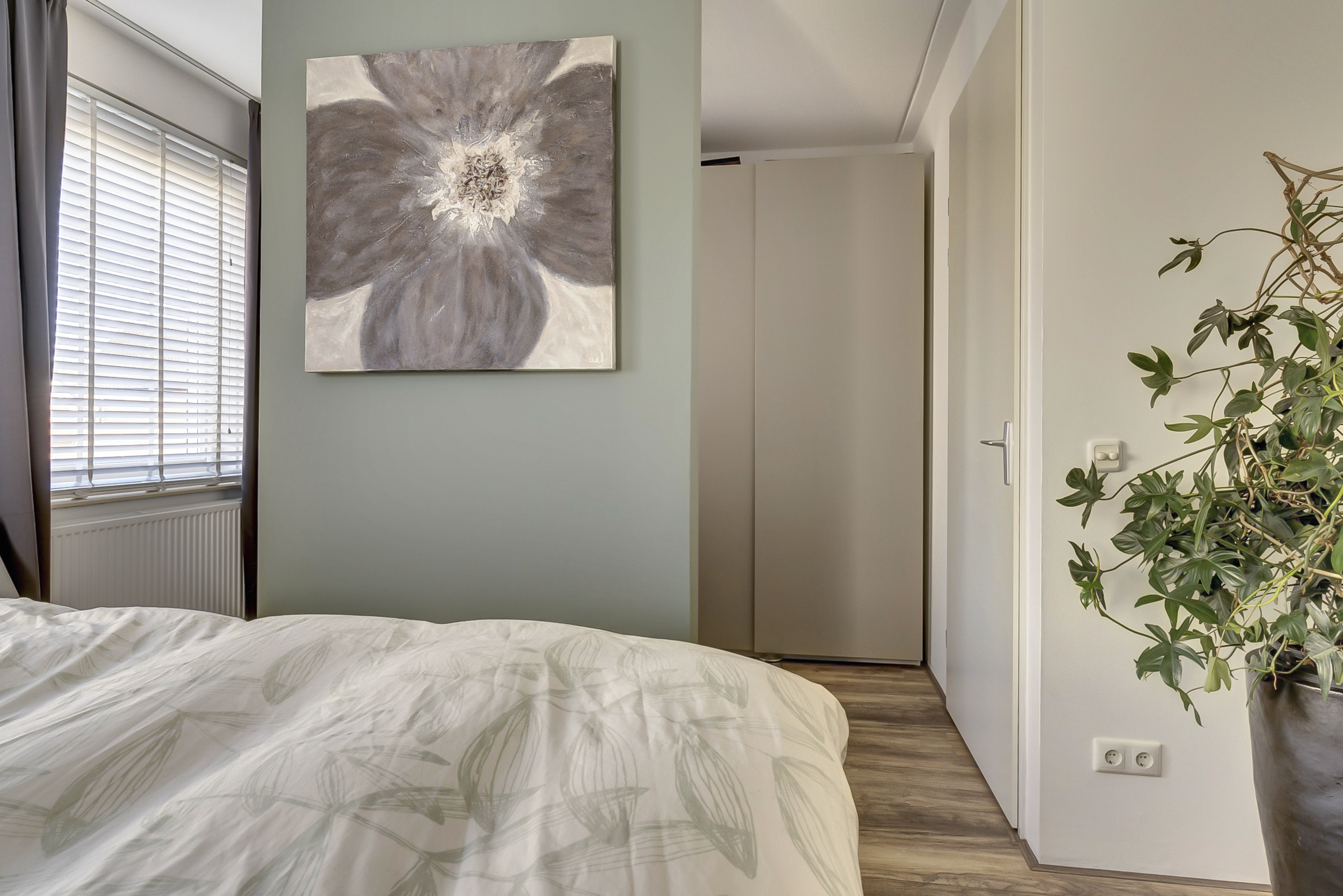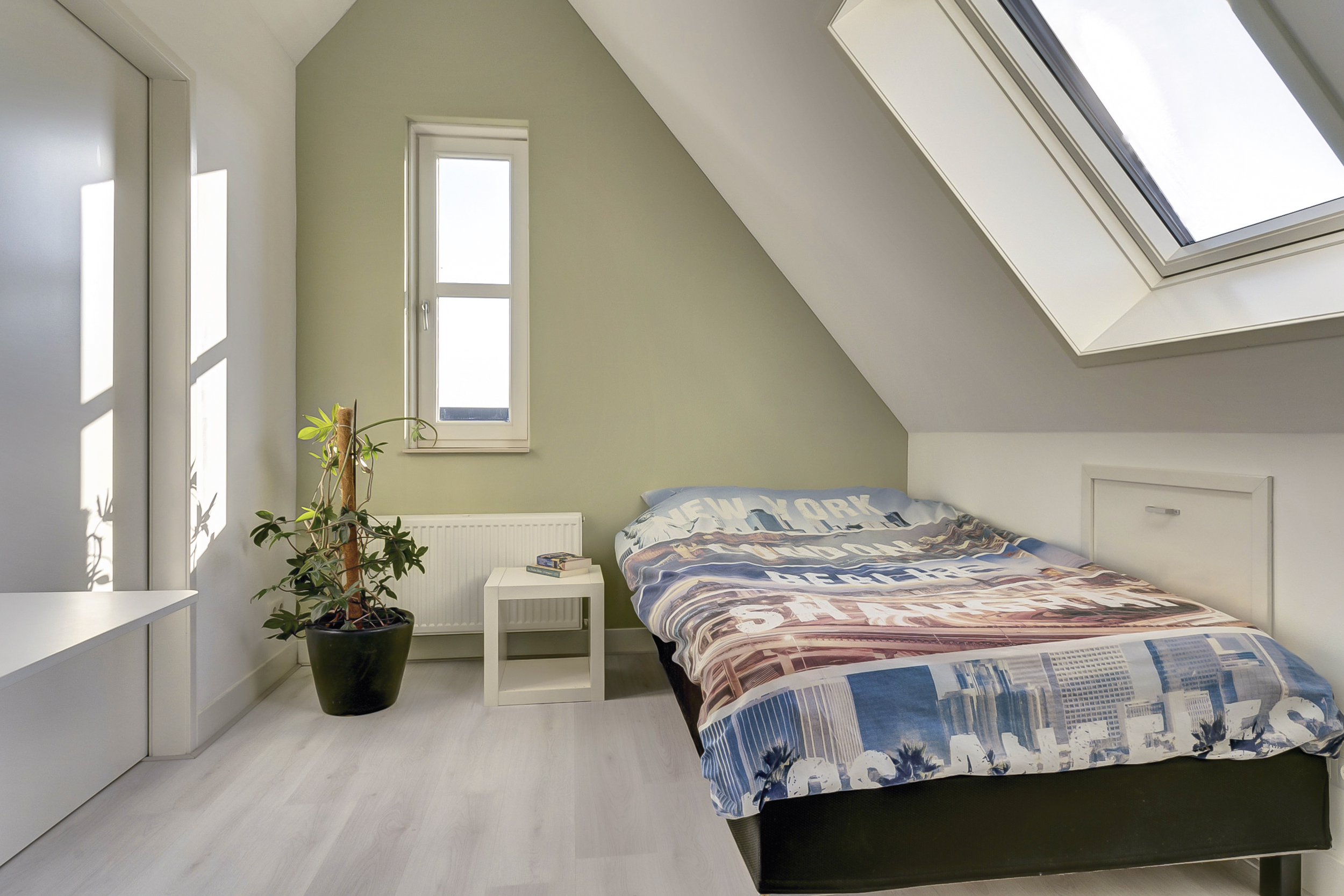 De tweede slaapkamer op deze verdieping is eveneens een fijne kamer en uitstekend geschikt als kinder-, werk- of logeerkamer.