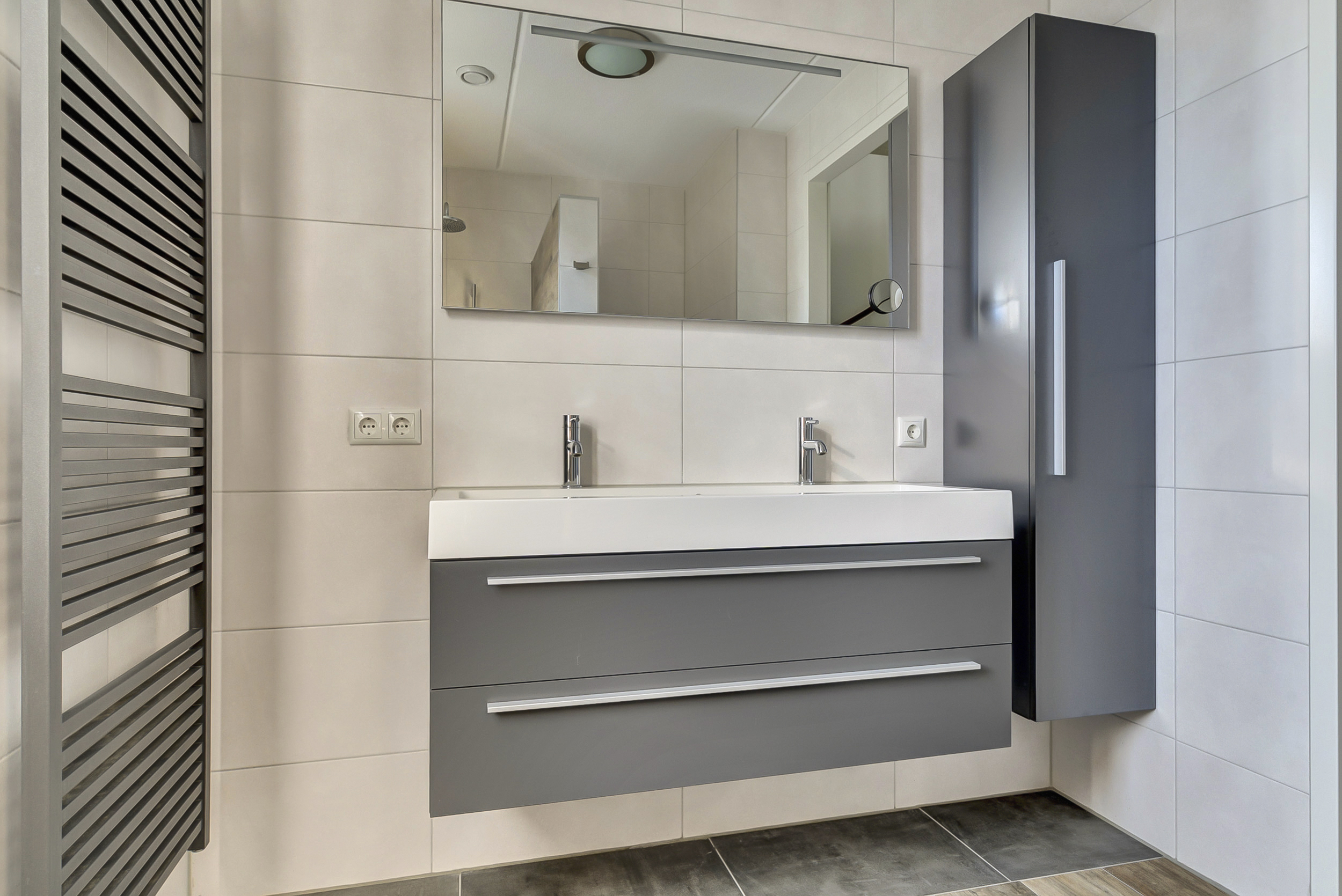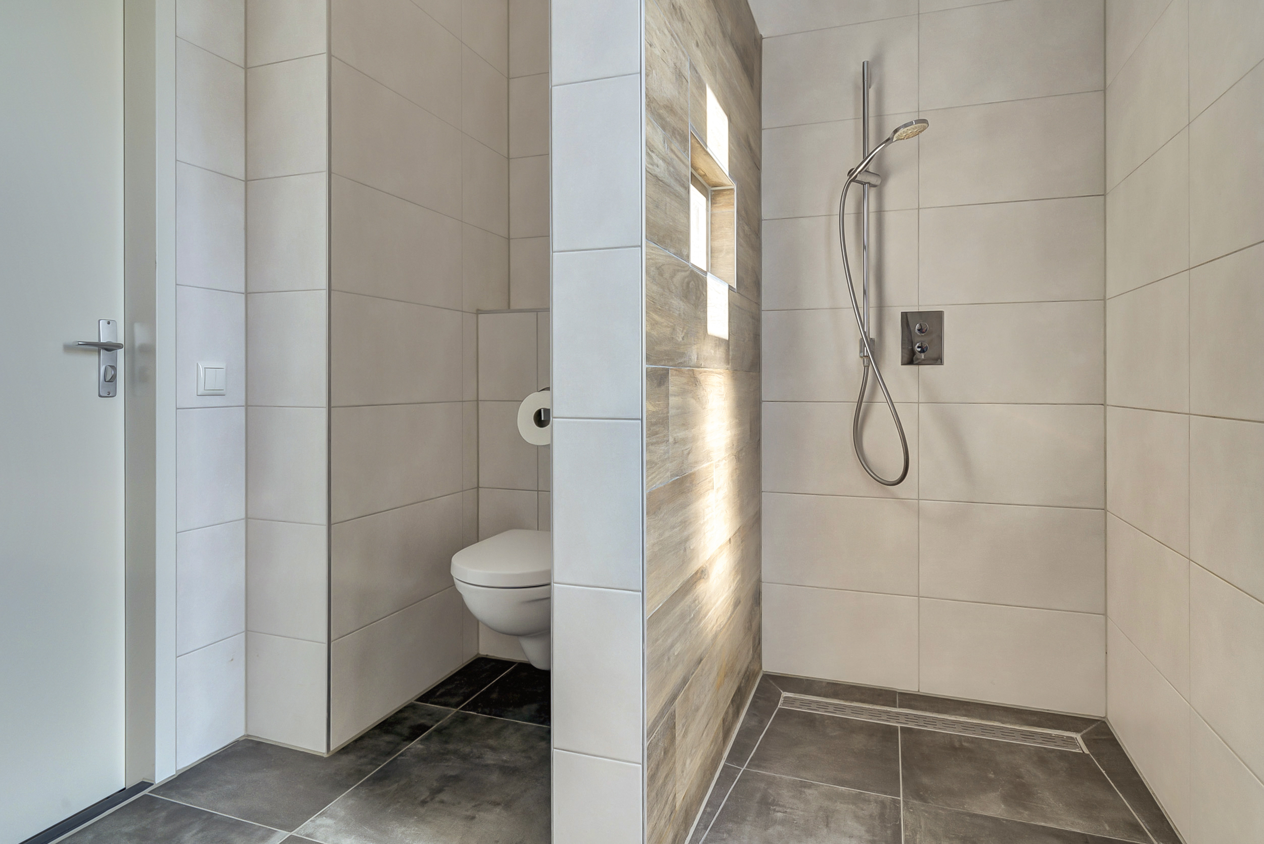 De badkamer is modern en compleet ingericht met een inloopdouche, een wastafel met meubel en een tweede toilet. Ook hier profiteer je van comfortabele vloerverwarming.