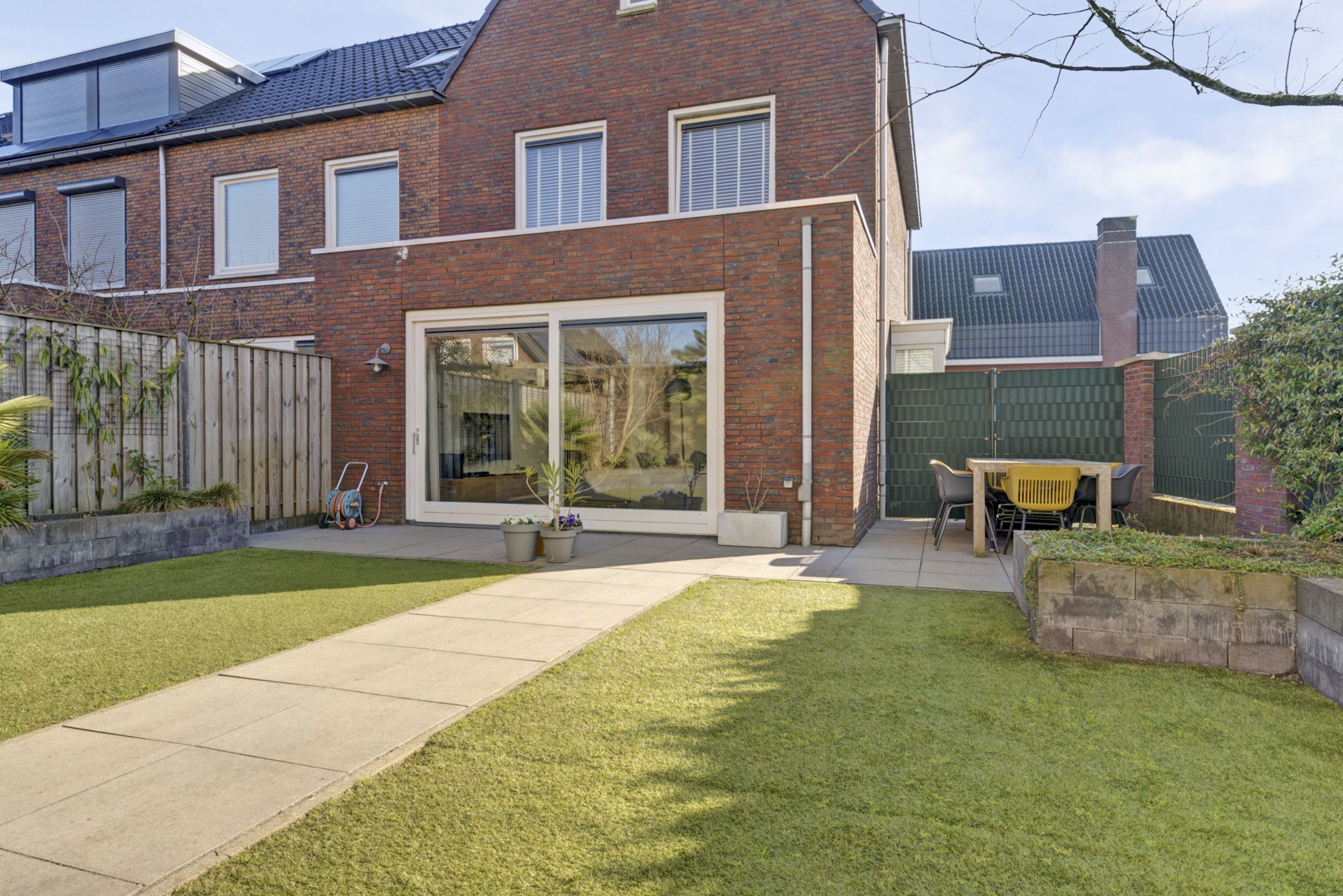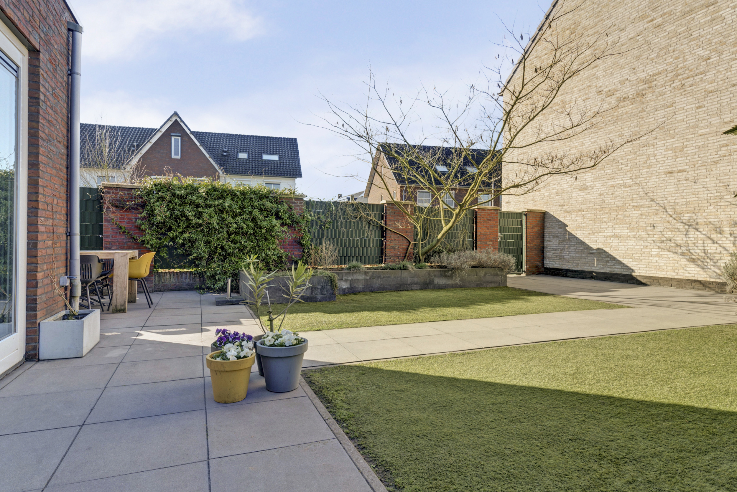 De achtertuin ligt op het westen, wat betekent dat je hier heerlijk van de middag- en avondzon kunt genieten. Een fijne plek om na een lange dag nog even buiten te zitten of gezellig met vrienden te barbecueën.