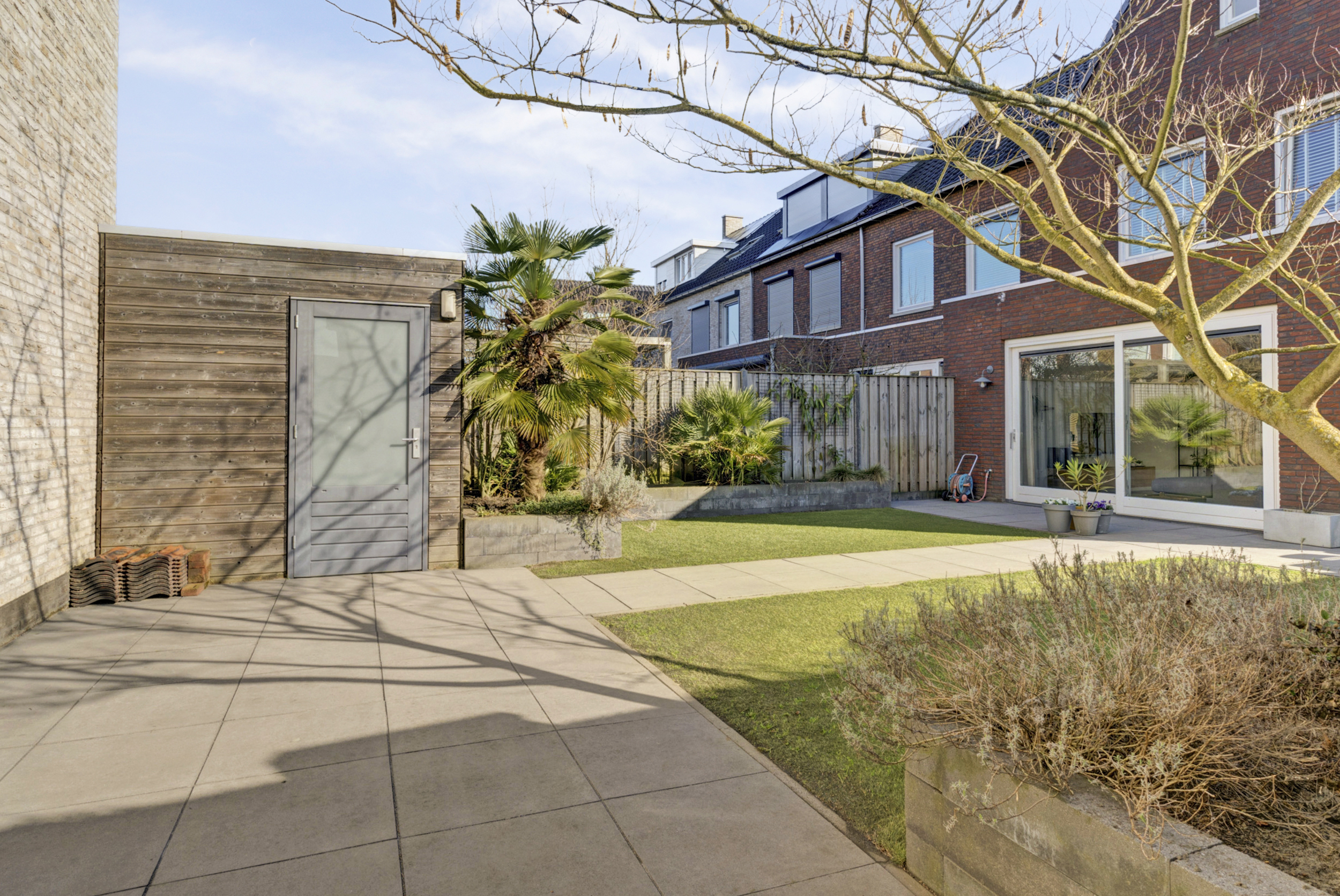 De tuin beschikt over een vrijstaande berging voor fietsen en tuingereedschap en heeft bovendien een achterom, wat erg praktisch is.