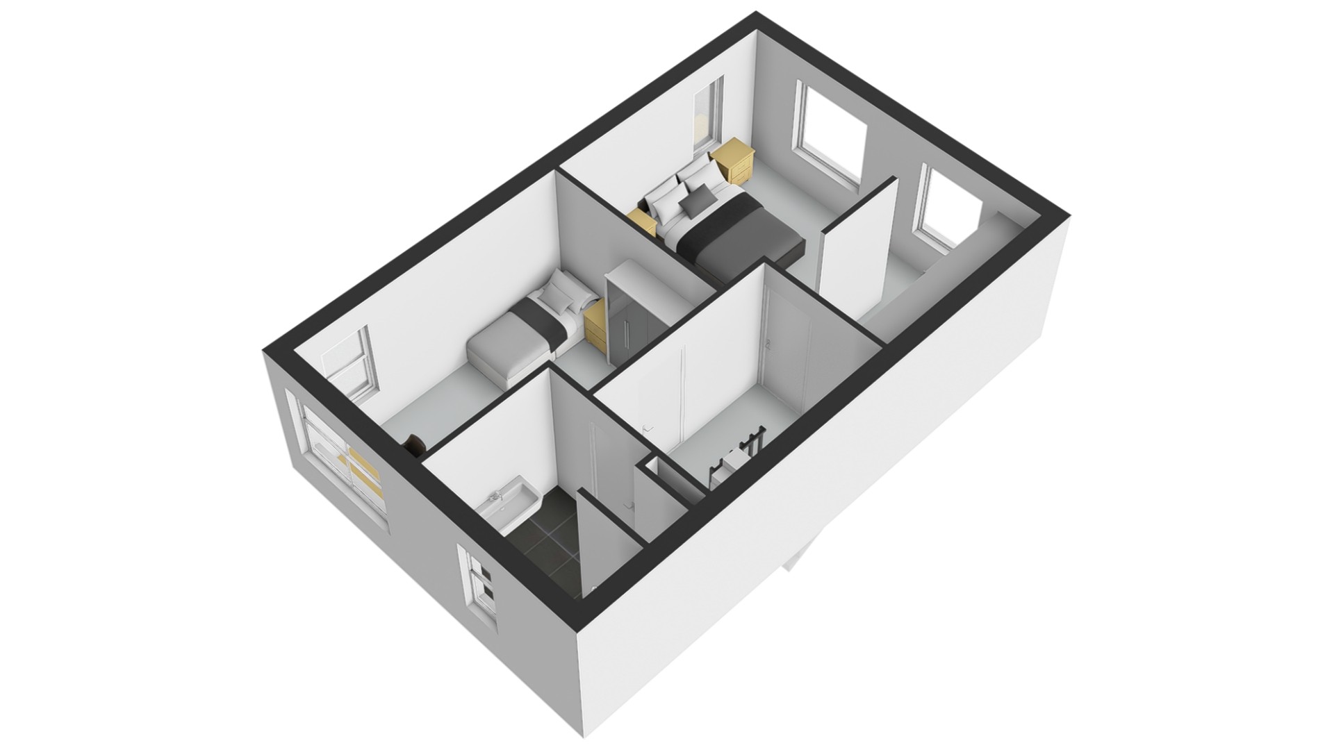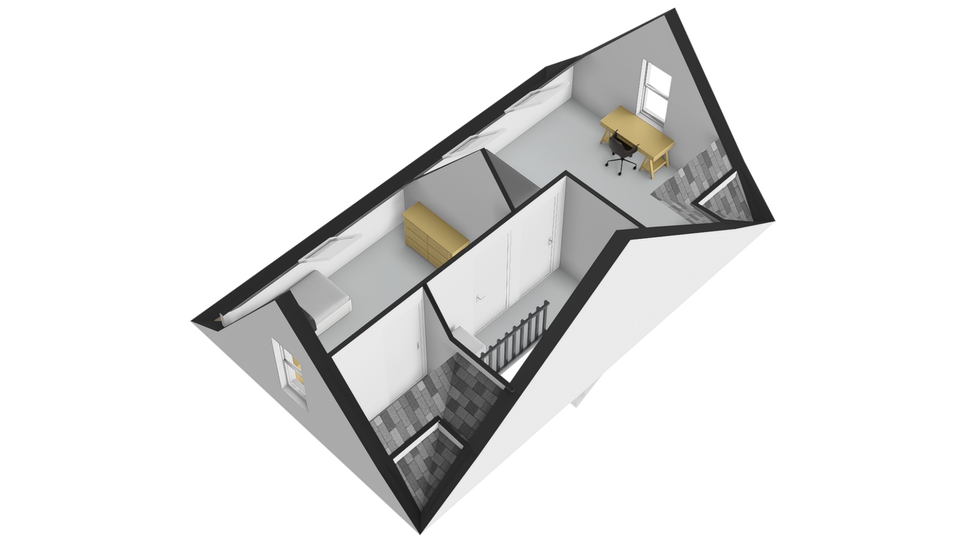 Op de eerste verdieping kom je uit op de overloop die toegang geeft tot twee slaapkamers en de badkamer.