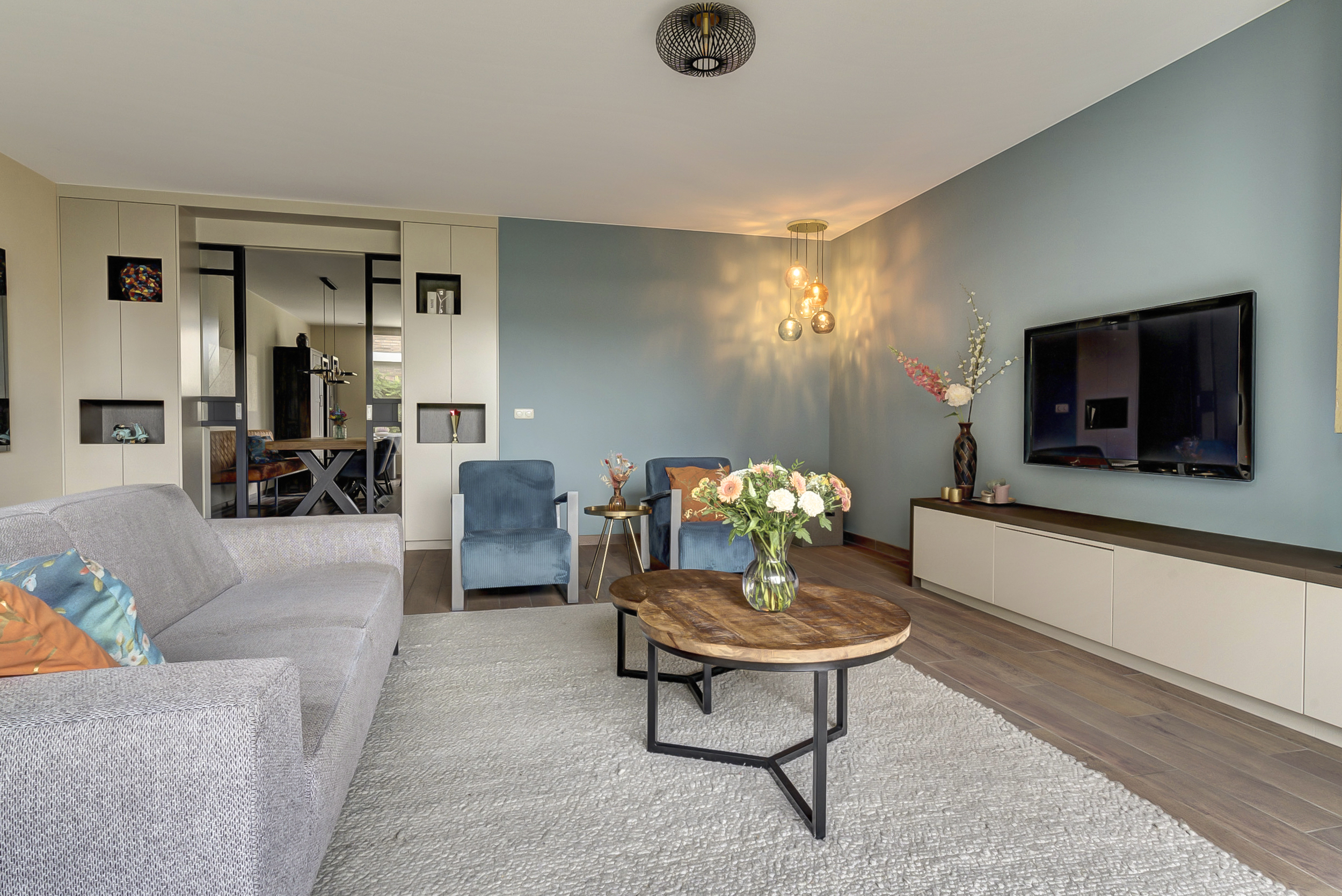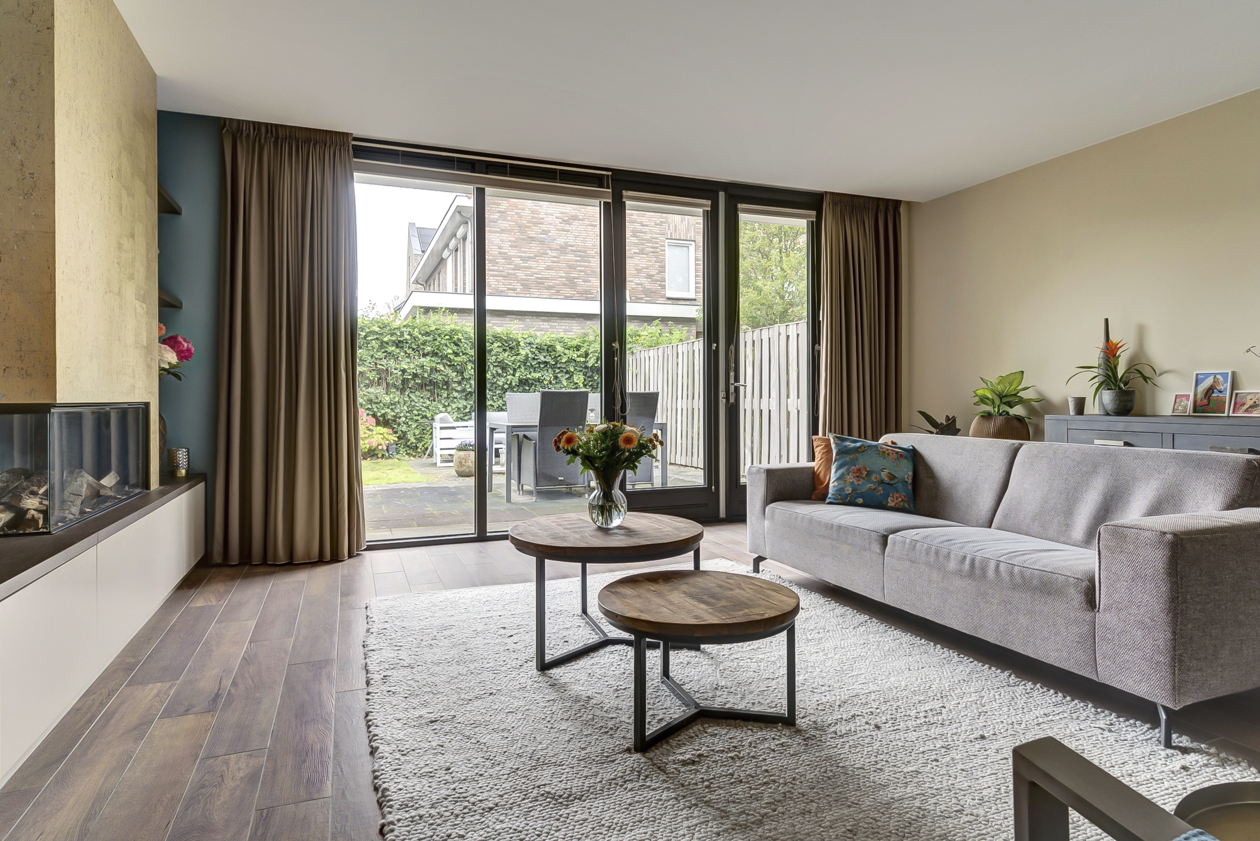 De tuingerichte woonkamer is heerlijk licht en biedt dankzij de uitbouw een zee aan ruimte. De dubbele tuindeuren verbinden binnen moeiteloos met buiten, terwijl de elektrische haard zorgt voor extra sfeer tijdens donkere dagen. De ensuite deuren scheiden de woonkamer op stijlvolle wijze van de woonkeuken en geven het geheel een karaktervolle uitstraling.