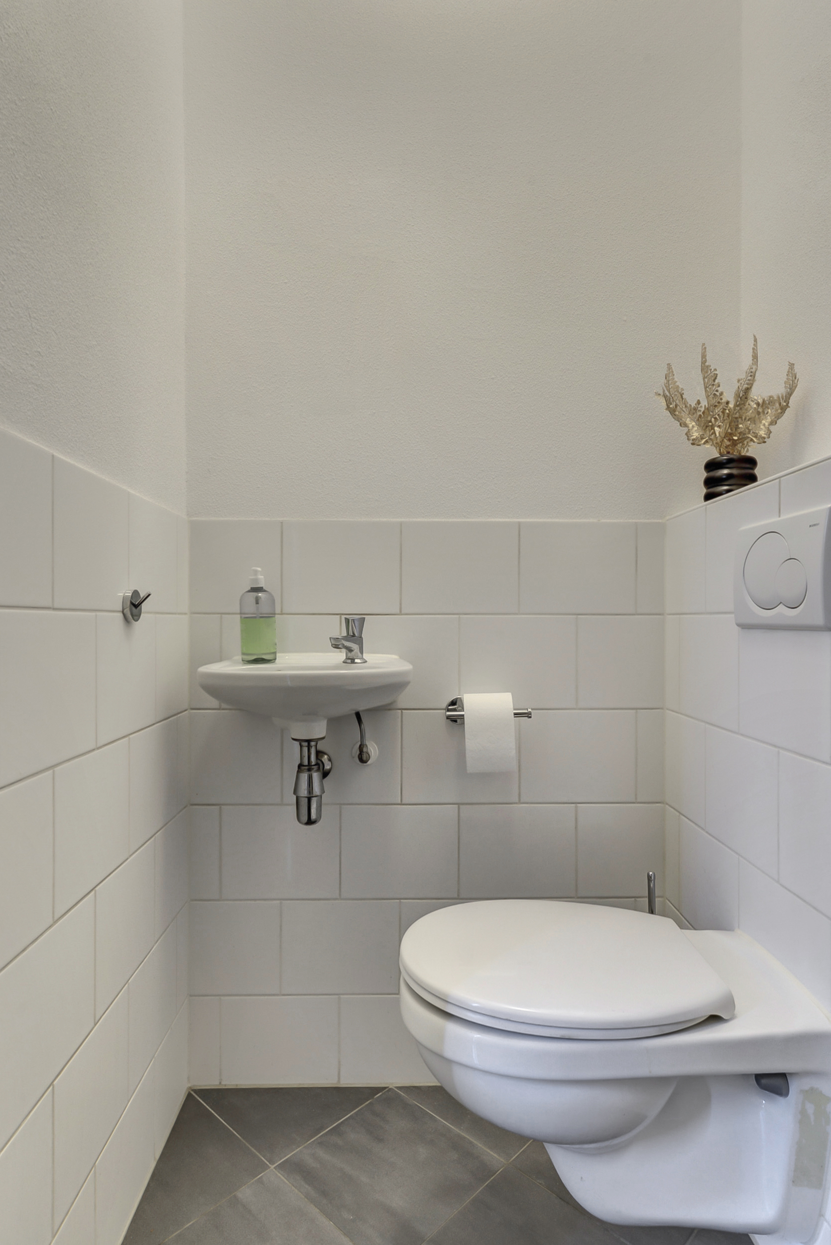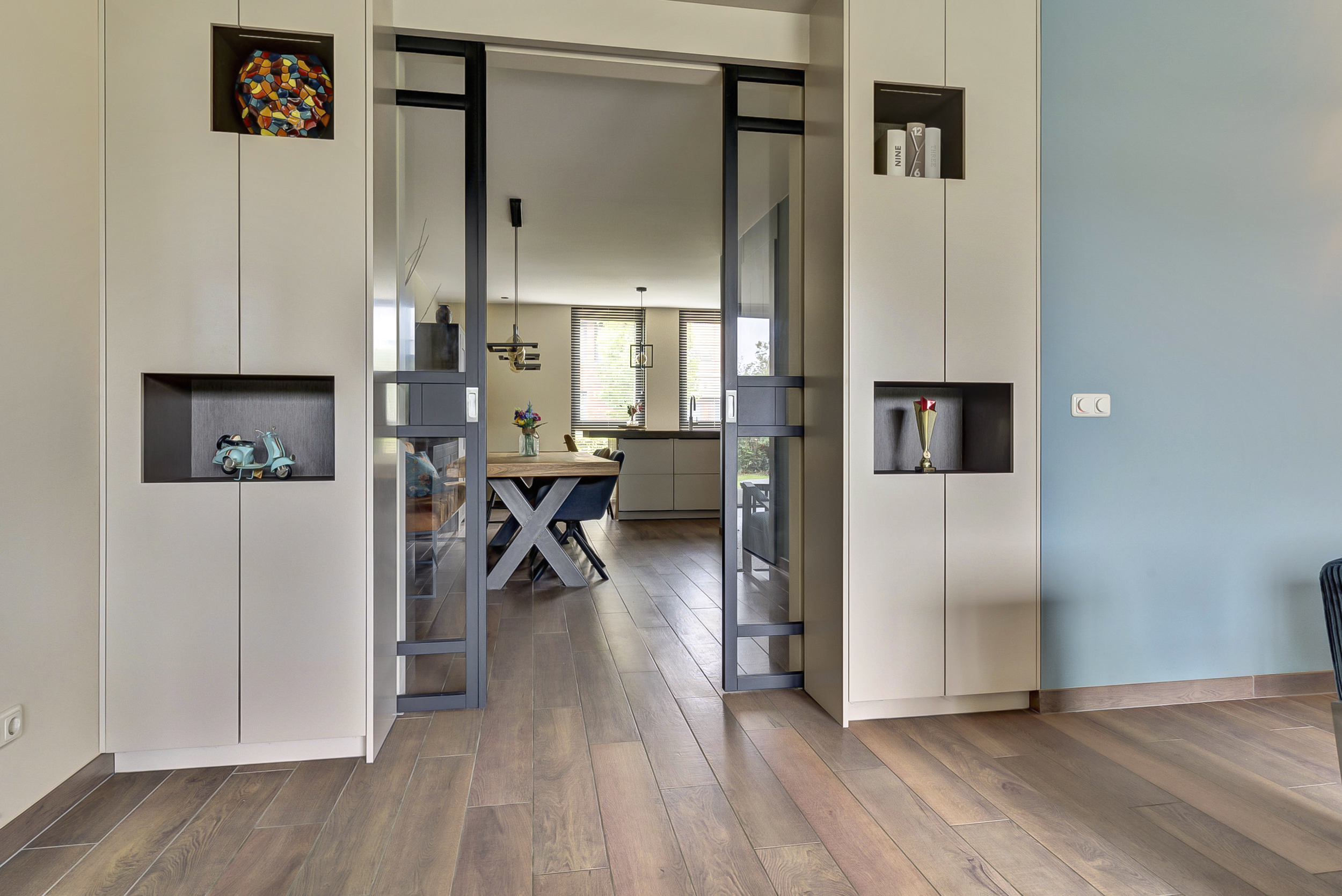 Via de ruime hal kom je binnen. Hier vind je het toilet en de trapopgang naar boven. Vanuit de hal stap je de indrukwekkende leefruimte binnen.