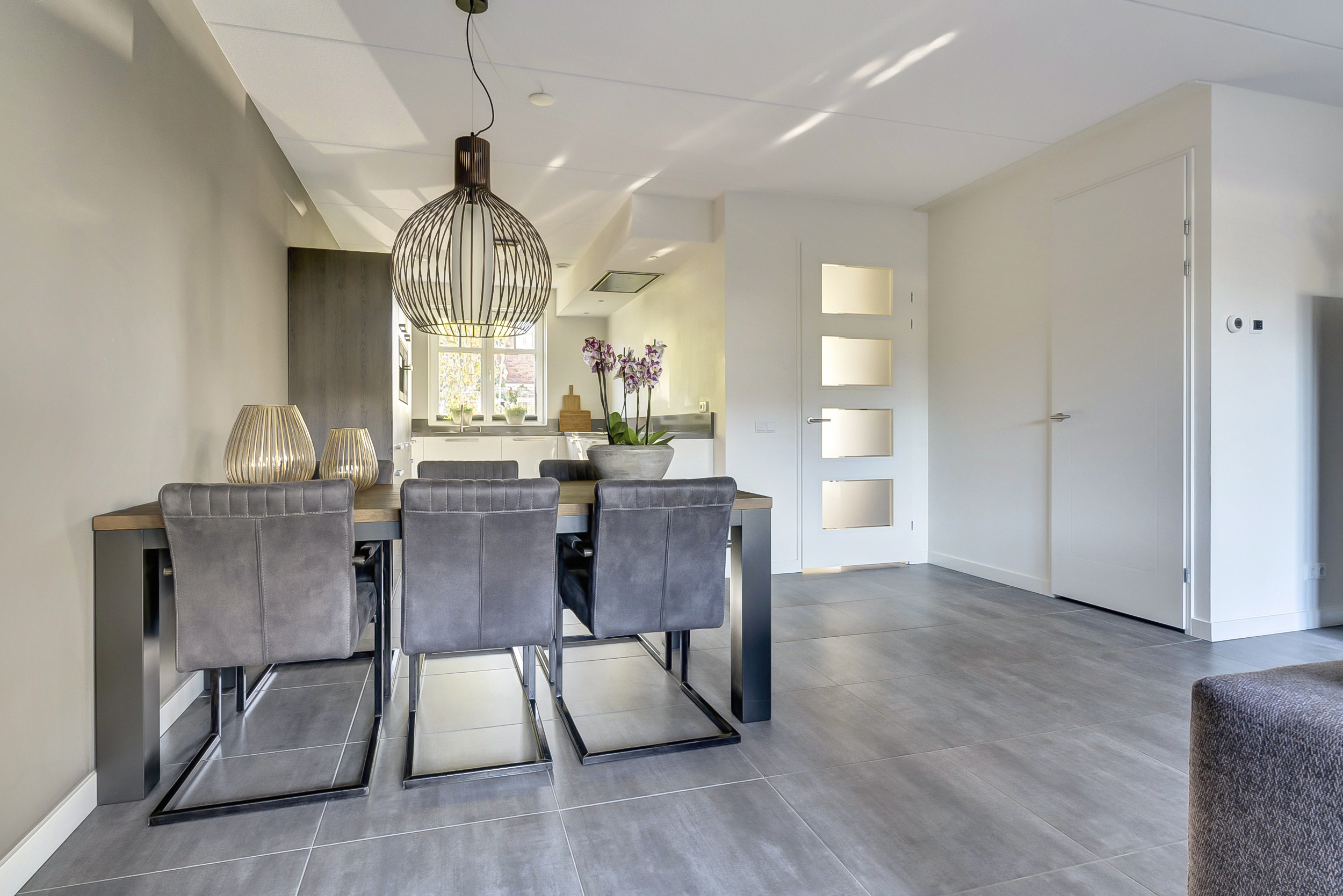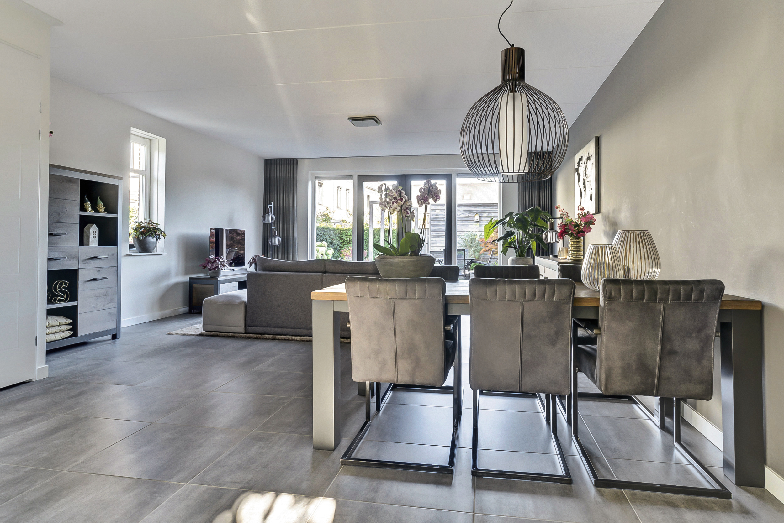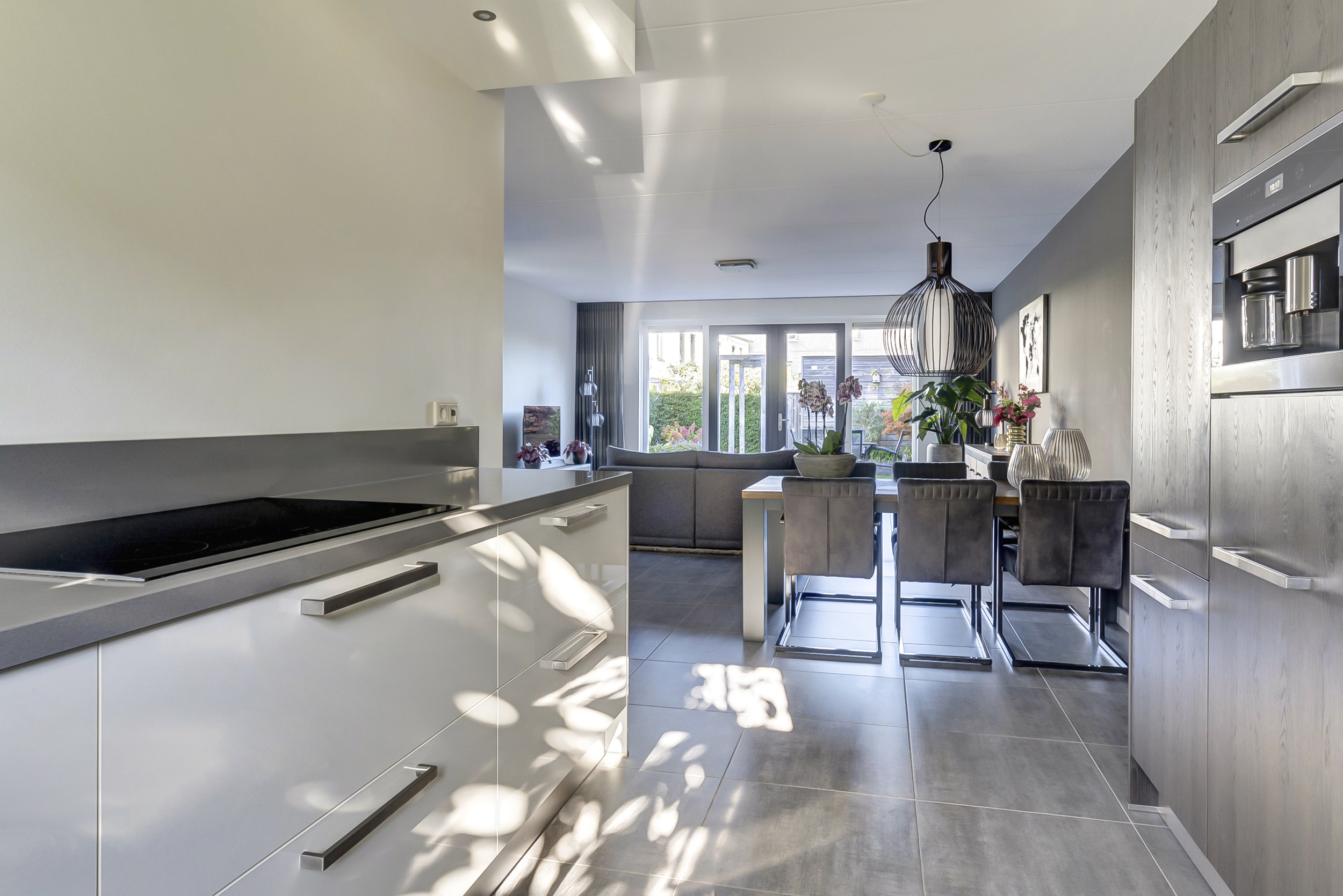 Binnen is gekozen voor hoogwaardige materialen en een luxe afwerking. Op de begane grond ligt een fraaie keramische tegelvloer met vloerverwarming: stijlvol, praktisch en comfortabel. De moderne keuken is in een ruime U-vorm opgesteld en beschikt over complete inbouwapparatuur. Hier kun je zonder moeite de mooiste diners bereiden, terwijl er voldoende plek is om gezellig samen te koken of te borrelen.