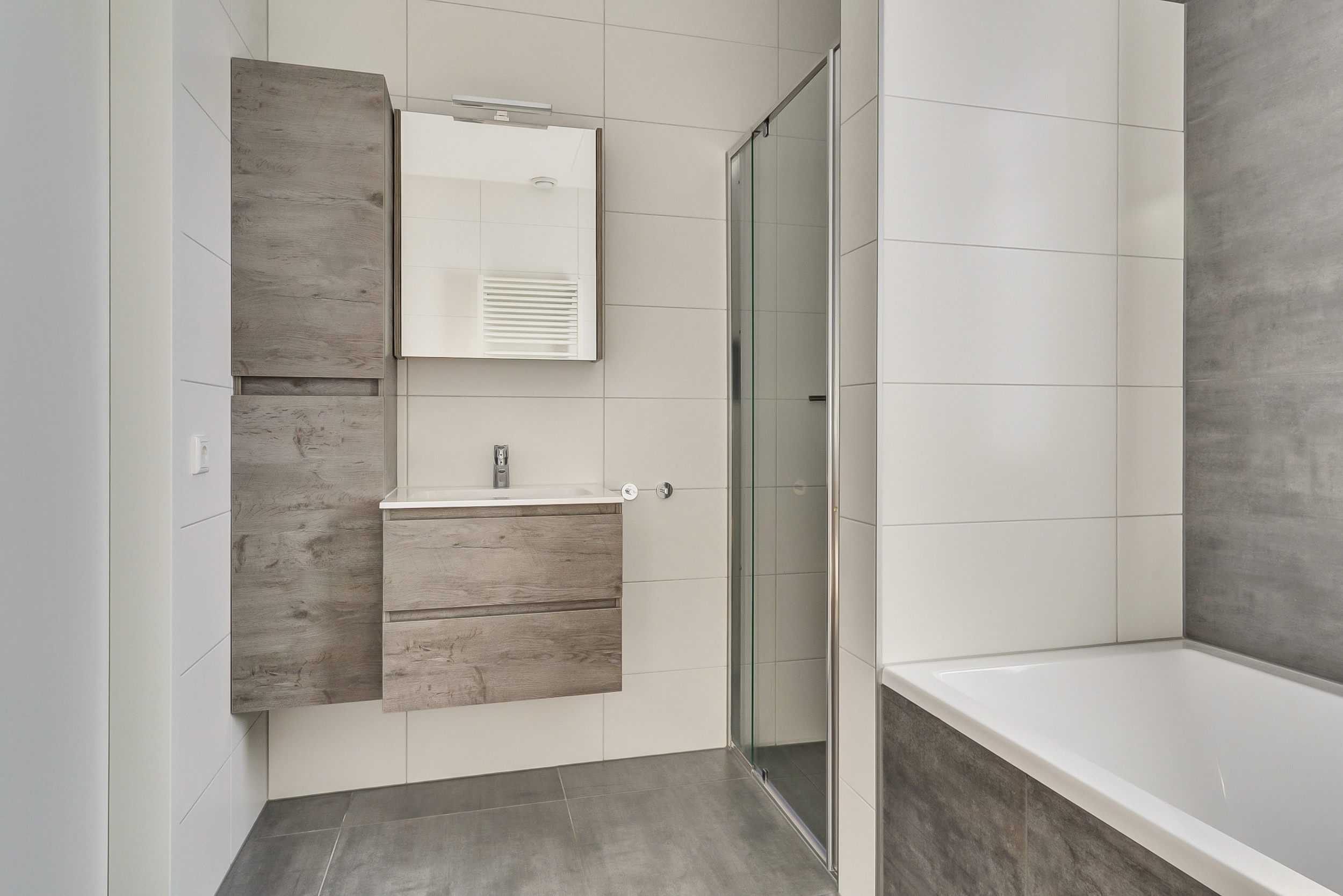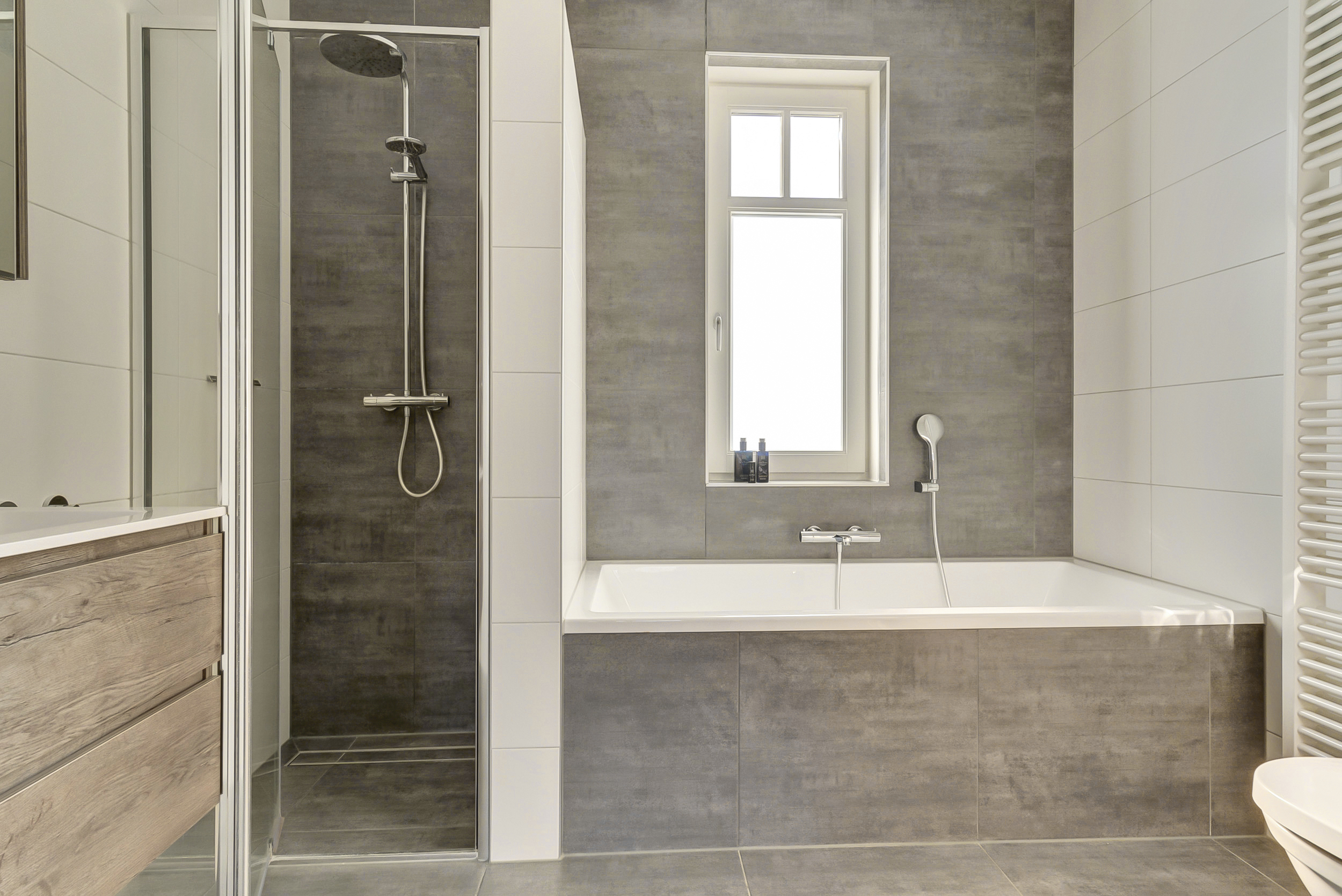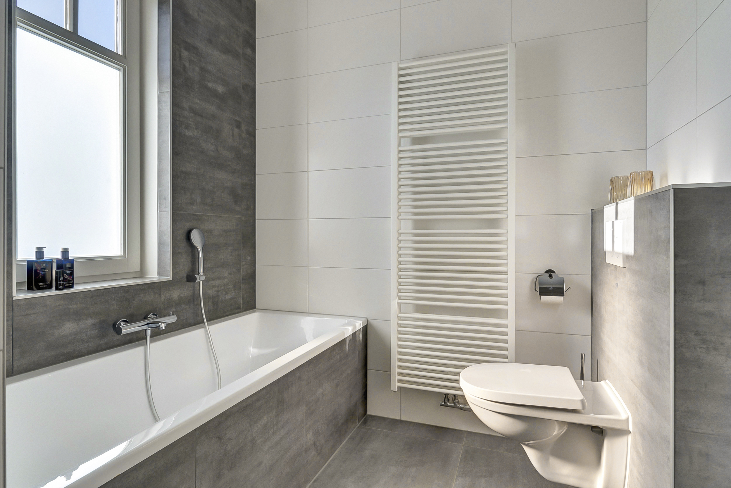 Luxe badkamer met ligbad, inloopdouche, wastafel met meubel, toilet en designradiator