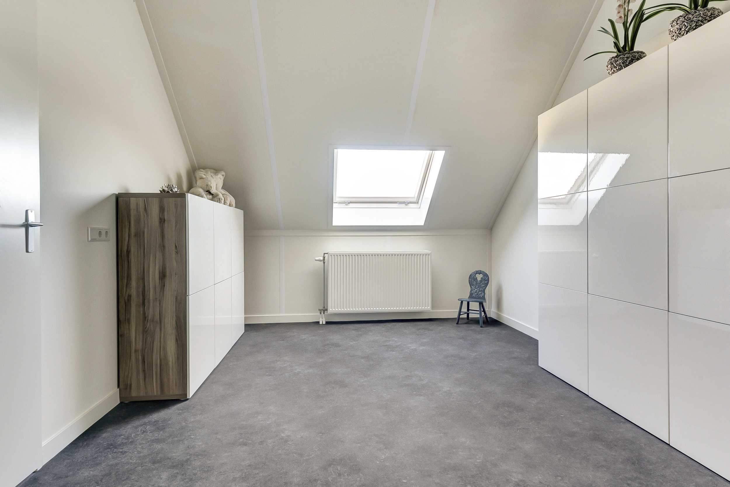 Via de overloop bereik je een royale zolderkamer met dakvenster. Hier is ook de aansluiting voor de wasmachine aanwezig. Een ideale ruimte als extra slaapkamer, werkplek of hobbykamer.