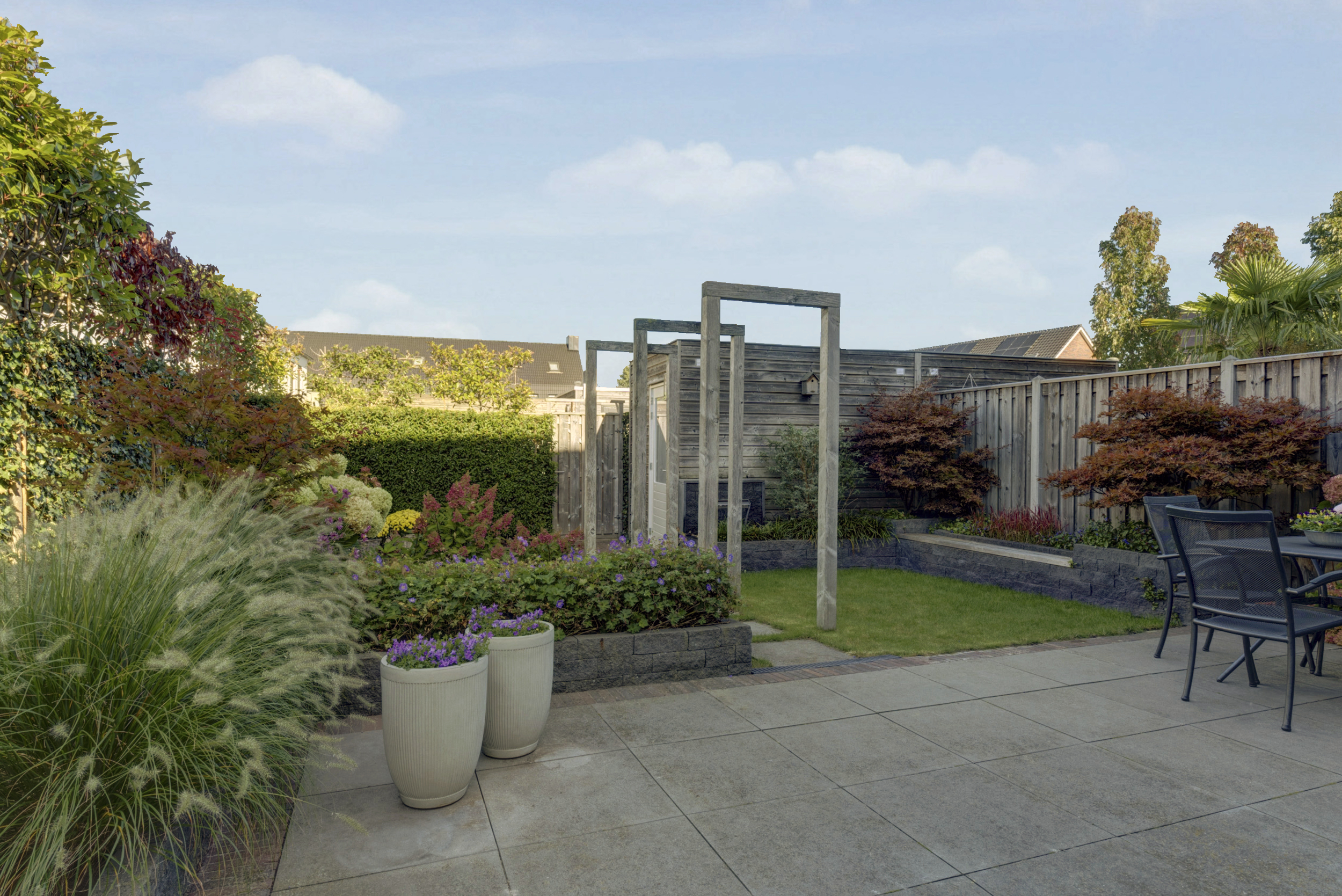 Grote, vrij gelegen en fraai aangelegde tuin met achterom en berging