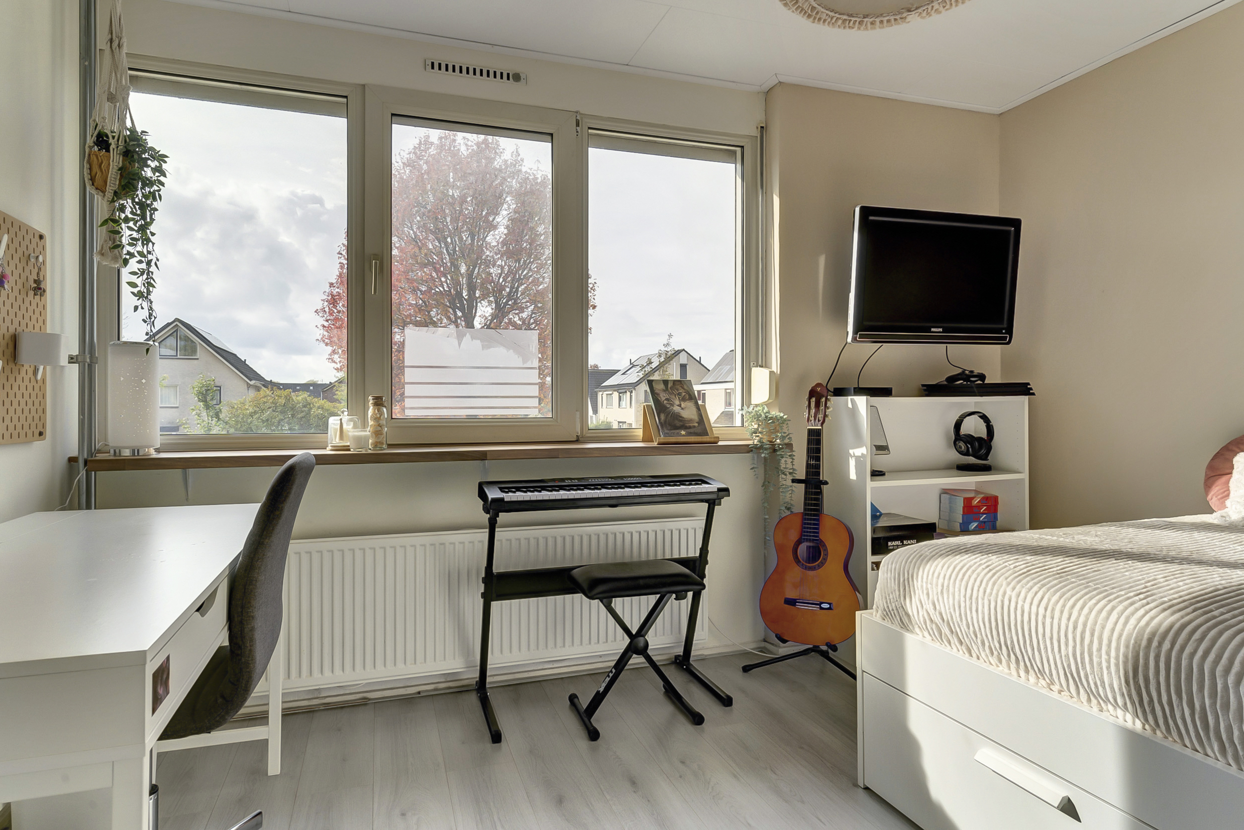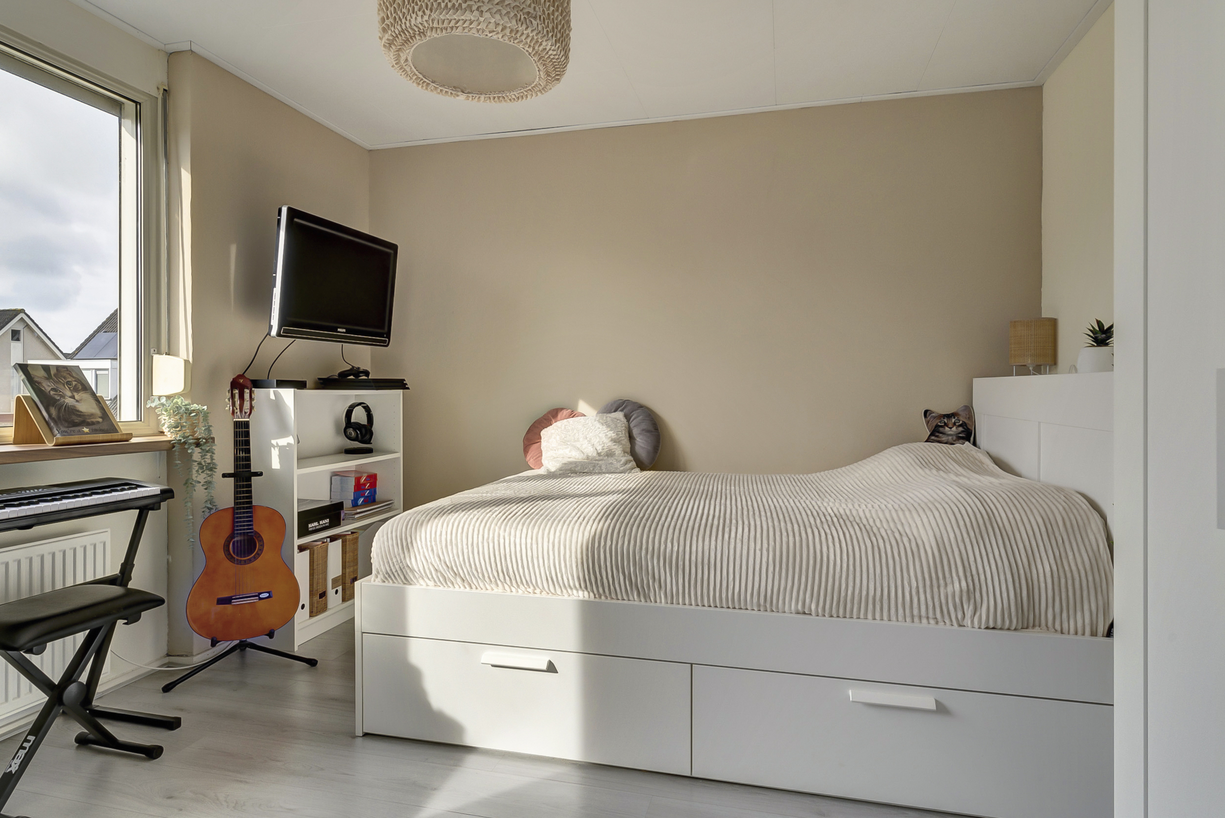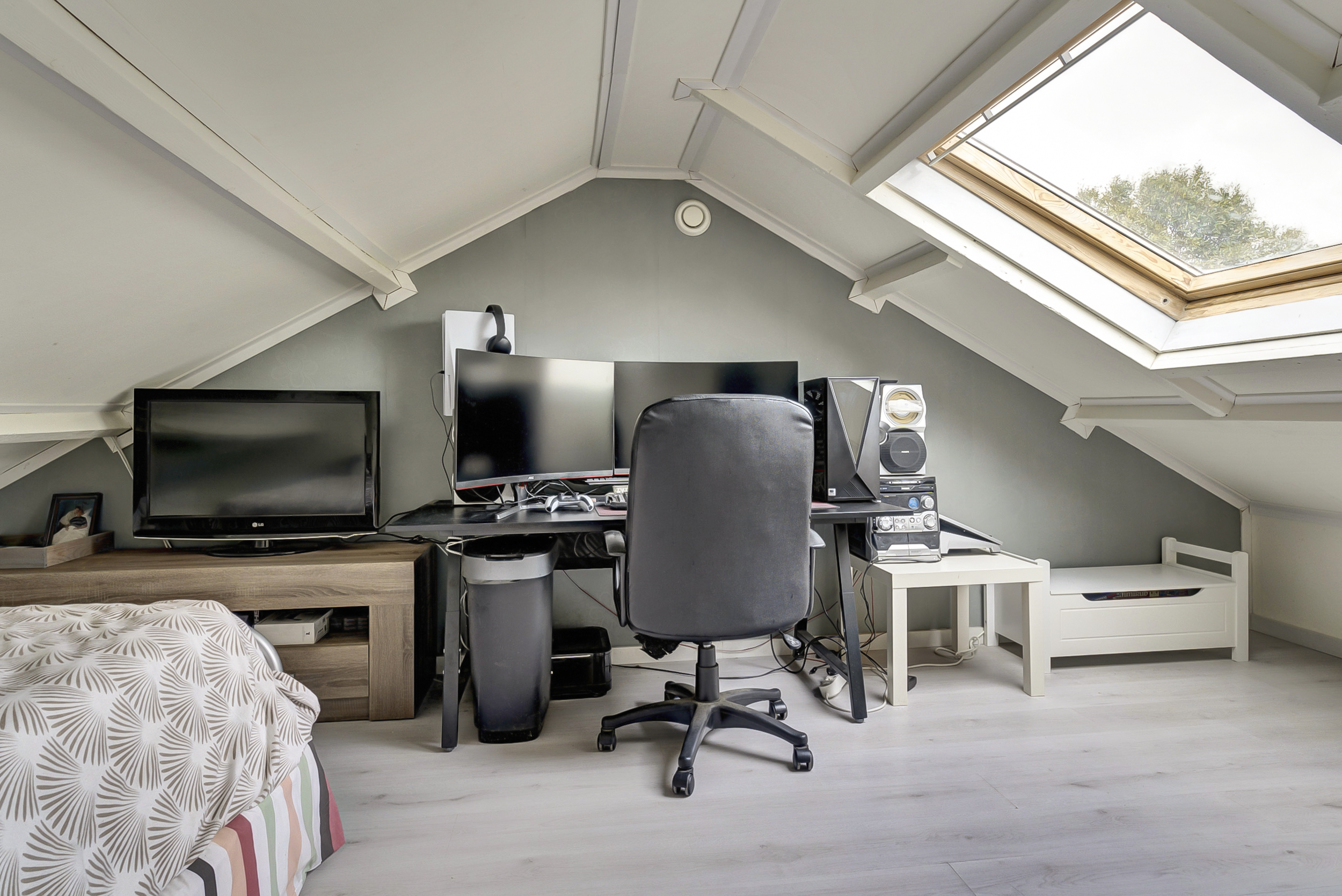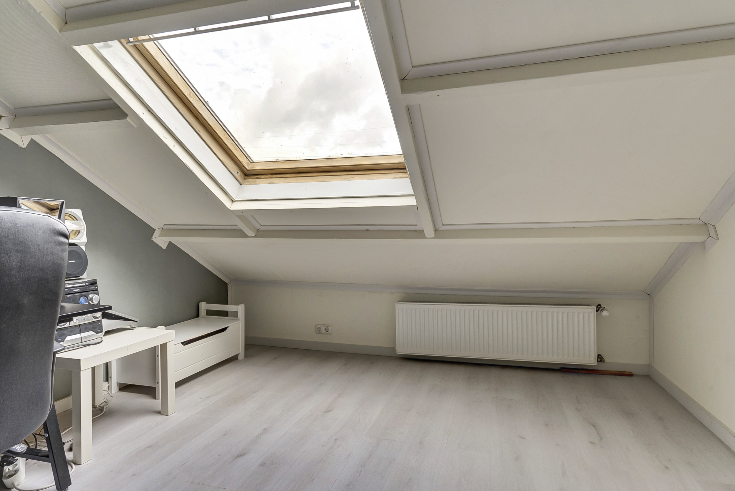 Via een vaste trap bereik je de tweede verdieping. Hier vind je een overloop met veel bergruimte en een derde slaapkamer met dakvenster. Deze kamer is ideaal als logeerkamer, werkkamer of hobbyruimte.