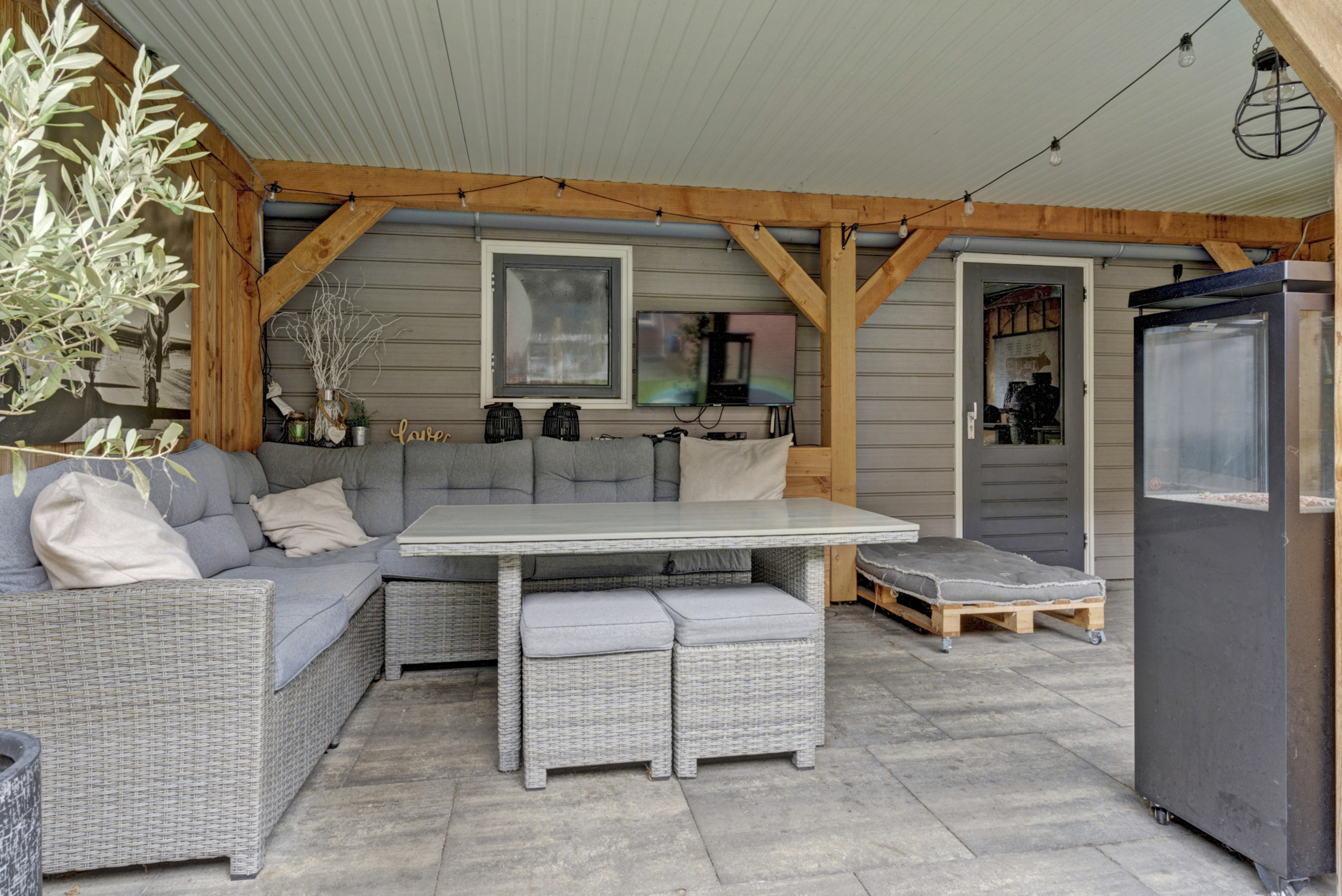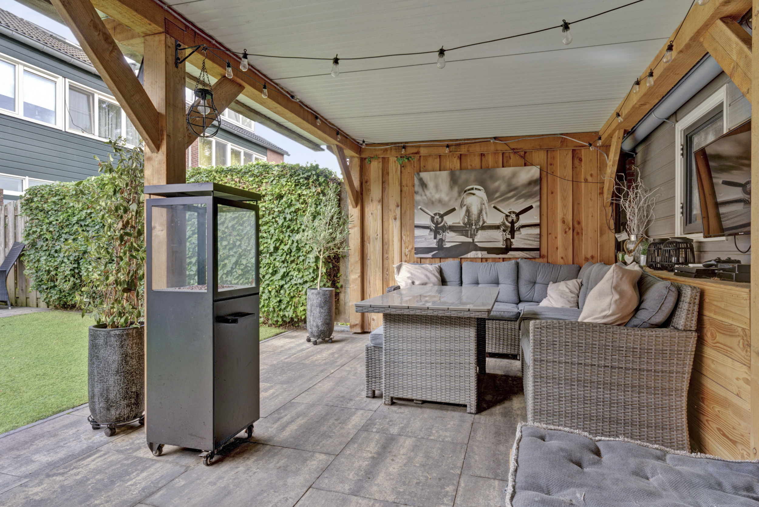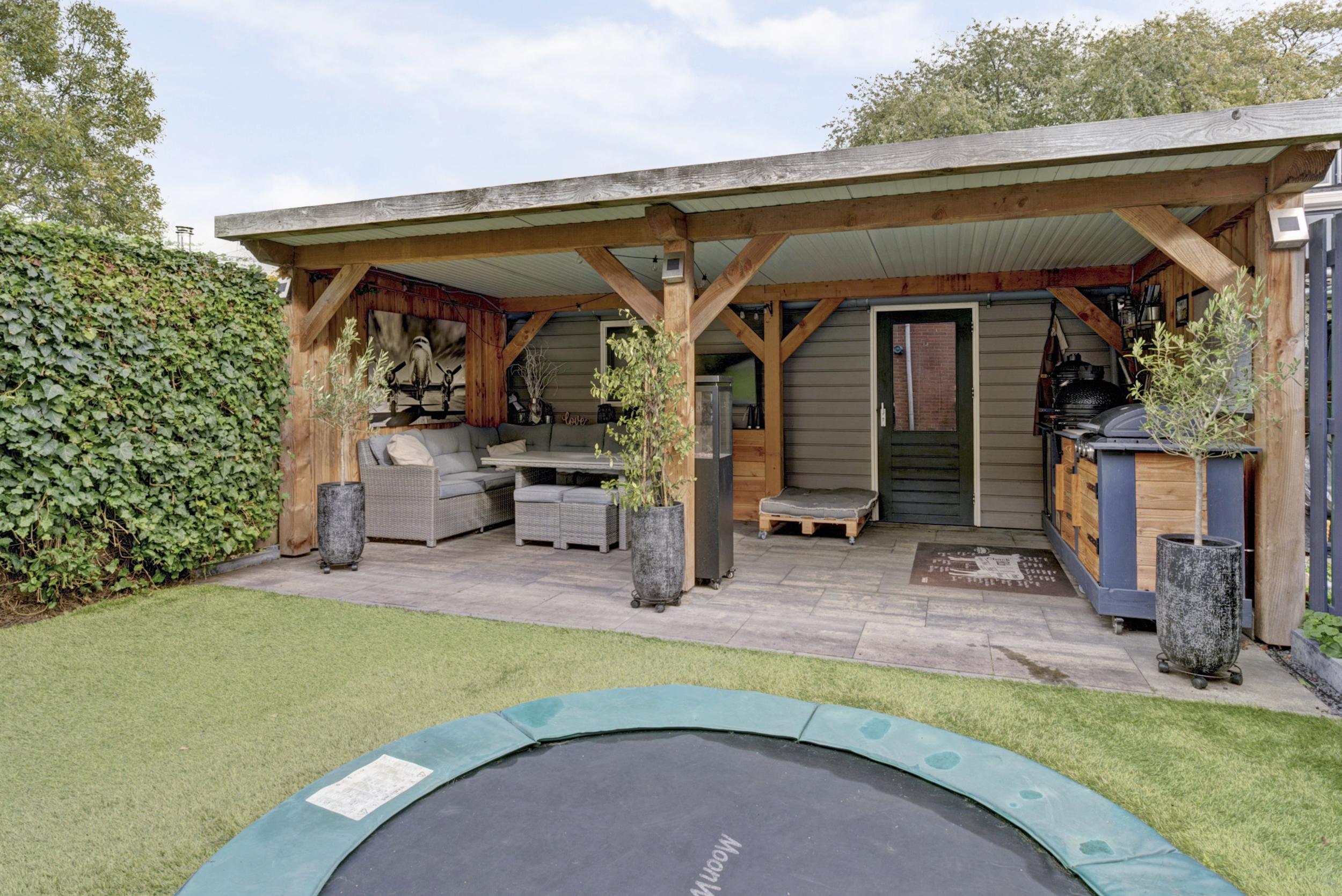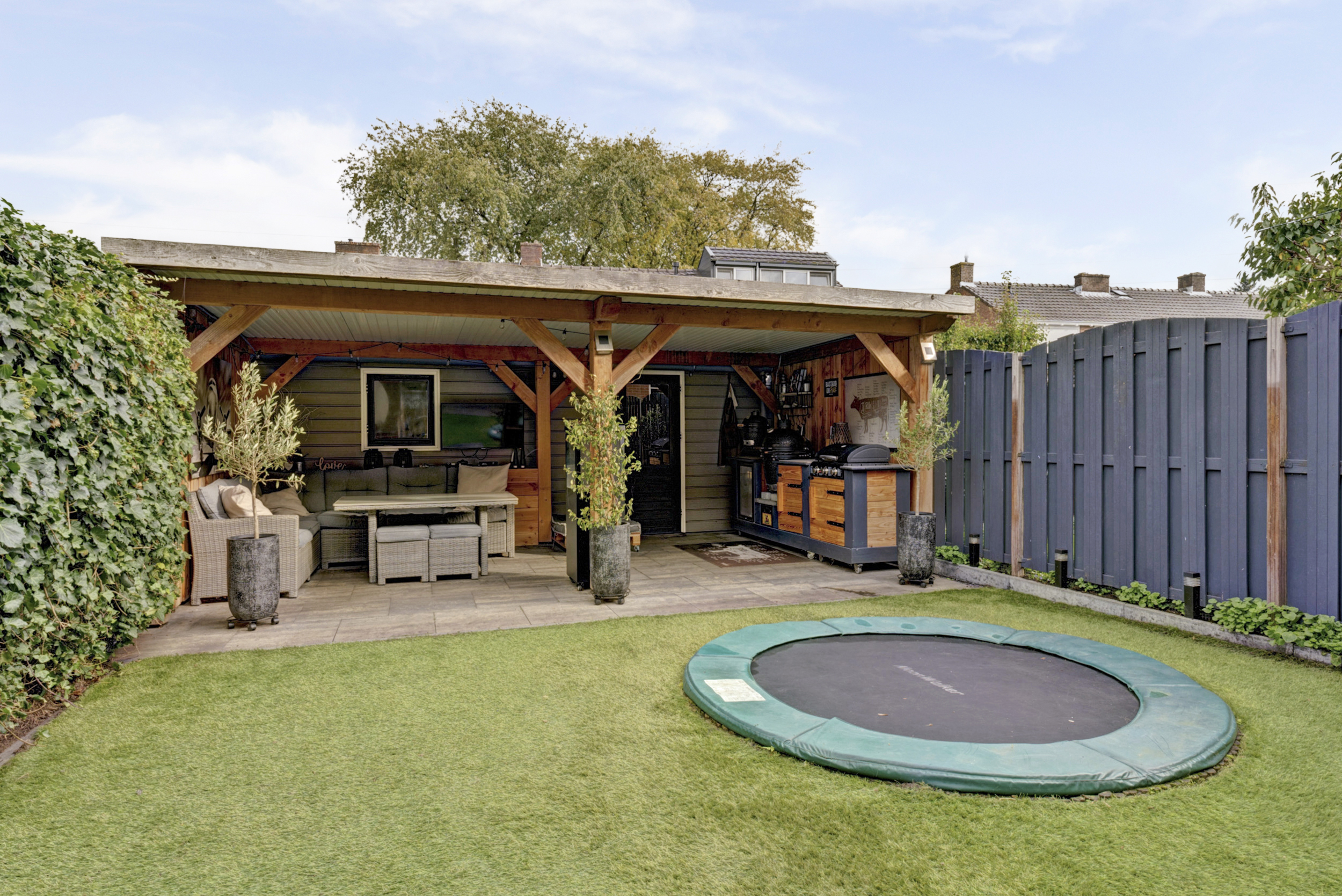 Vanuit de bijkeuken loop je zo de achtertuin in. Deze is fraai aangelegd, onderhoudsvriendelijk en voorzien van een ruime overkapping waar je het hele jaar door heerlijk kunt zitten. Of het nu zomer of herfst is, dit is de plek om te ontspannen met een kop koffie of een goed glas wijn. Achter in de tuin vind je een berging voor fietsen en tuingereedschap, en via de achterom bereik je gemakkelijk de straatzijde.