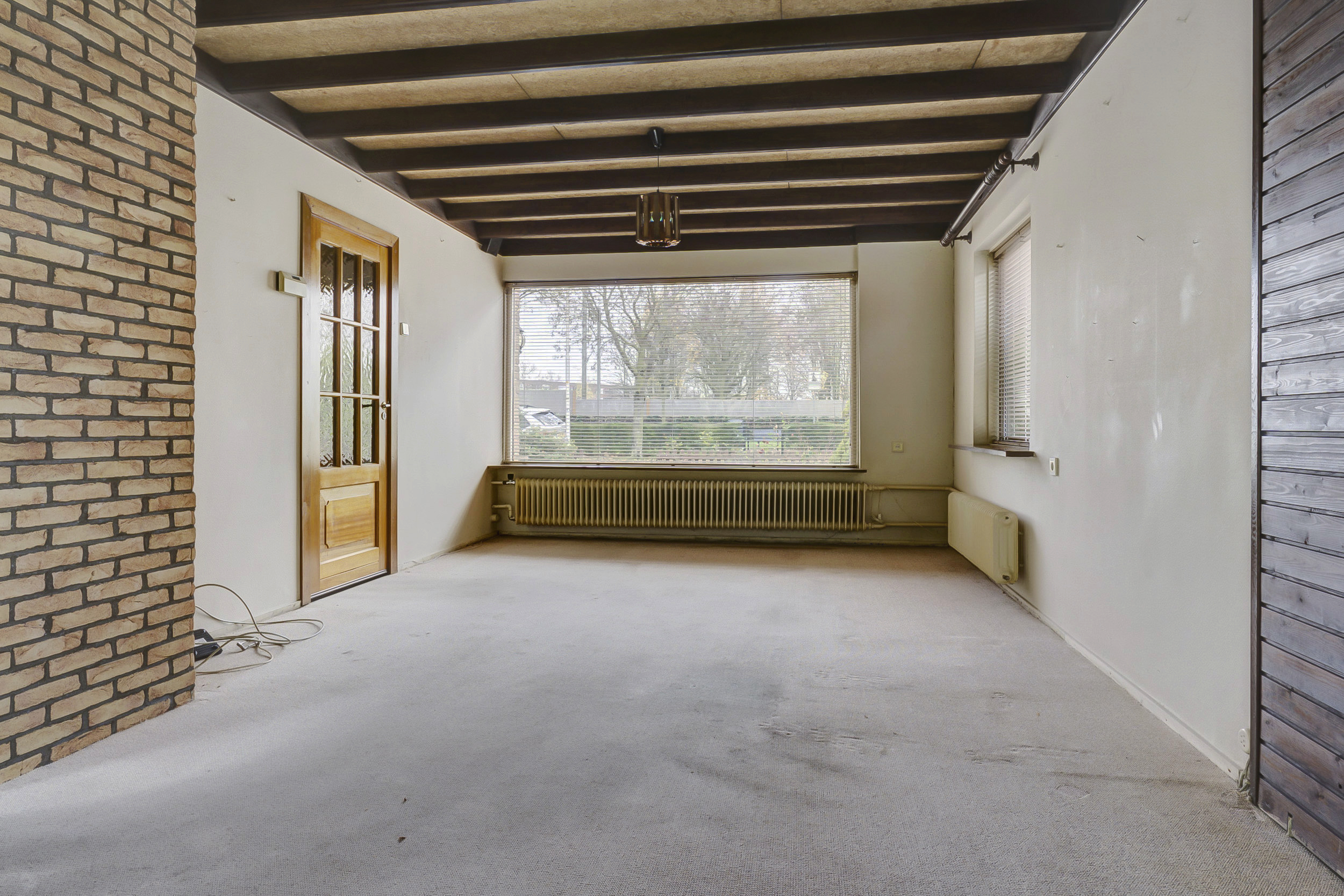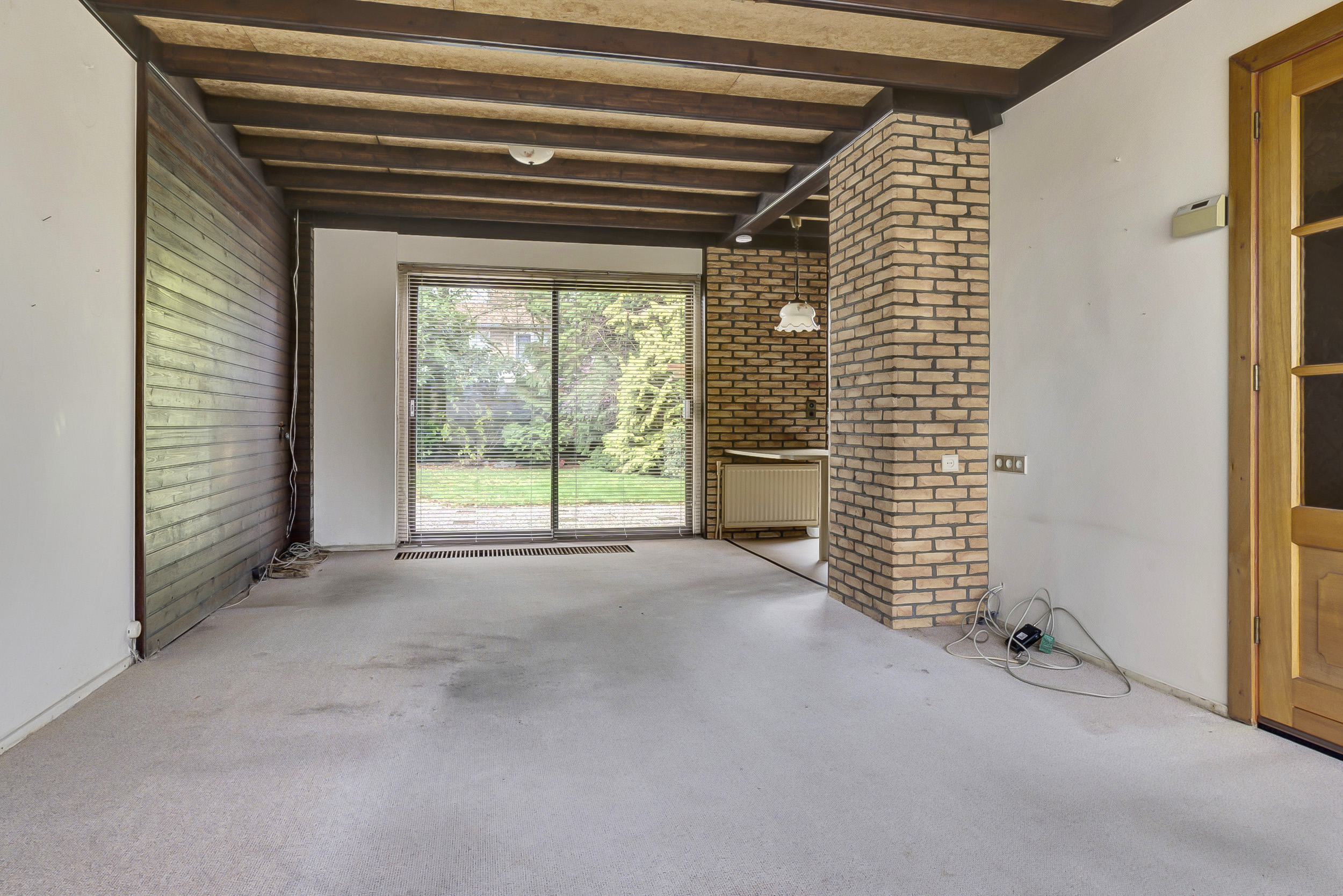 Je komt binnen in de hal, waar je toegang hebt tot het toilet en een praktische provisieruimte onder de kelder – ideaal voor extra opslag. Vanuit de hal loop je door naar de woonkamer, een fijne, lichte ruimte met uitzicht op zowel de voor- als achtertuin. Hier zie je meteen de mogelijkheden voor een eigentijdse leefruimte, eventueel met openslaande deuren naar de tuin.